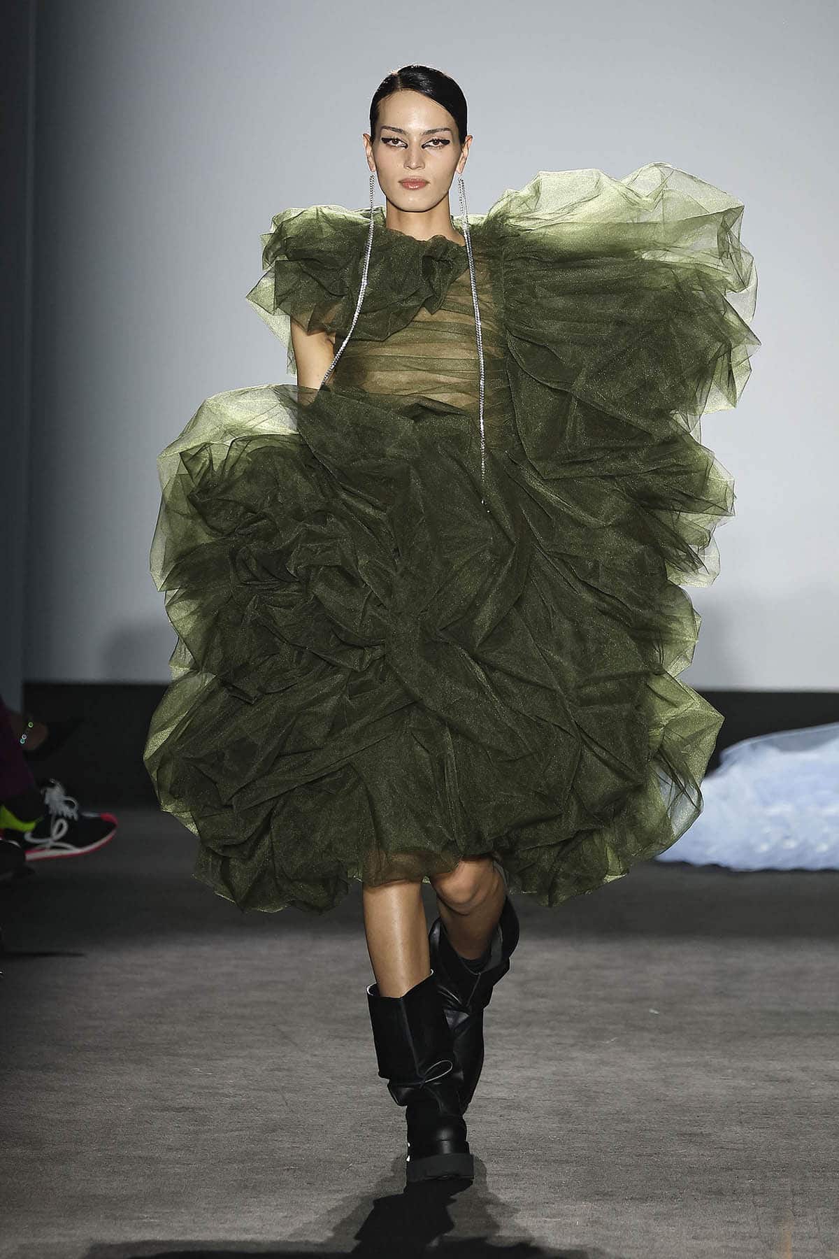 “Esta colección trata de la búsqueda, del ser, de la apuesta por uno mismo, para los que no encuentran su sitio y del crecimiento”, confiesa la diseñadora sevillana. Una colección llena de volúmenes y transparencias, texturas únicas donde el tul ha sido el protagonista.