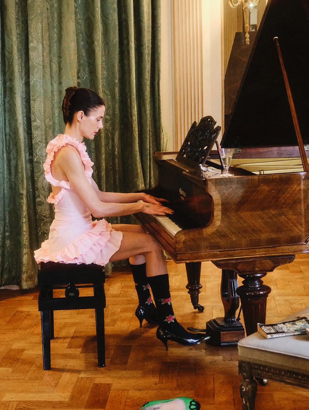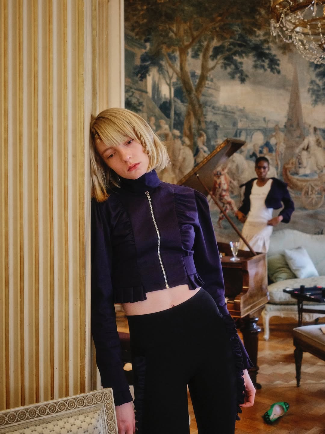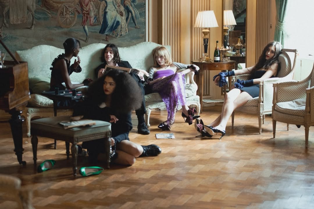 Safdie’s silhouettes hover between inheritance and improvisation. Pink satin glows under imaginary chandeliers, golden bouclé captures the shimmer of polite conversation, and faux fur trimmings operate as fragile shields for debutantes still learning the codes of the room. Powdered eyeshadow spills inside an evening bag, champagne stains rental polo dresses, abandoned heels slide across the rug. Etiquette is rehearsed with precision, yet boredom simmers beneath the surface.