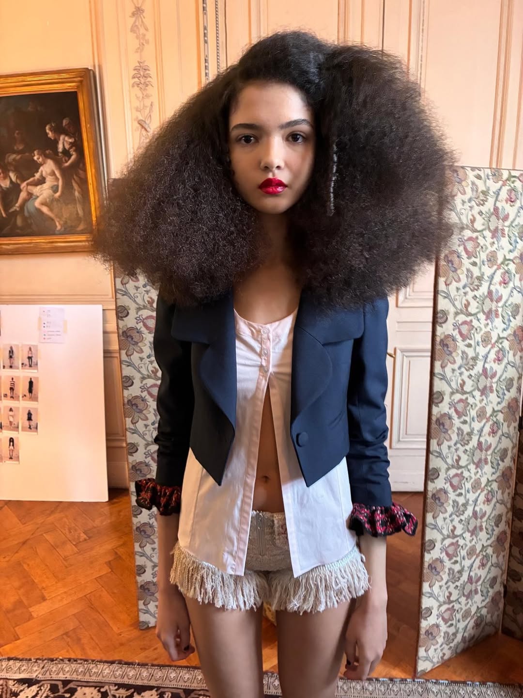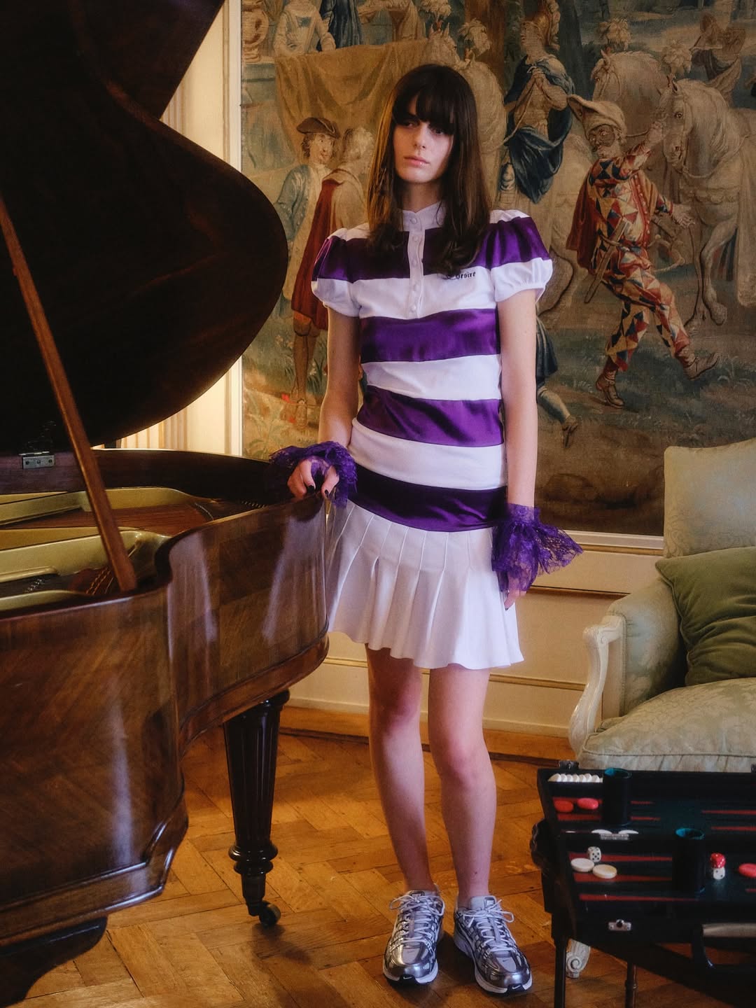 Bunny Bell arrives dressed correctly, almost impeccably. A suited wool coat and tweed bolero are taken away, unveiling a wardrobe that studies the rituals of becoming. Prim conformity slowly curdles into rebellion. Purple lace bodysuits function as delicate armour, while raw denim capris pass as eveningwear. Pleated miniskirts coexist with floor length gowns, structured jackets are cropped into gestures of youthful interruption, and floral cotton jersey blooms at the cuffs with chiffon frills that resemble corsages pinned for a coming out that feels both imposed and self directed.