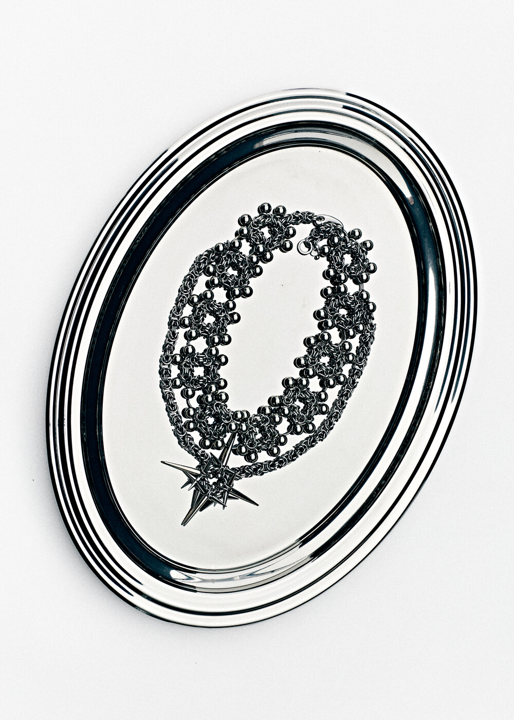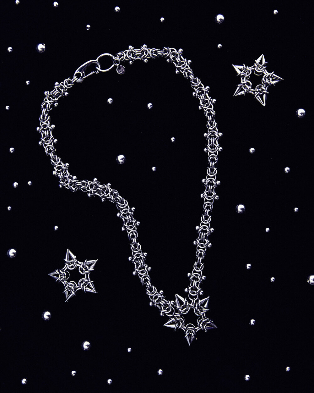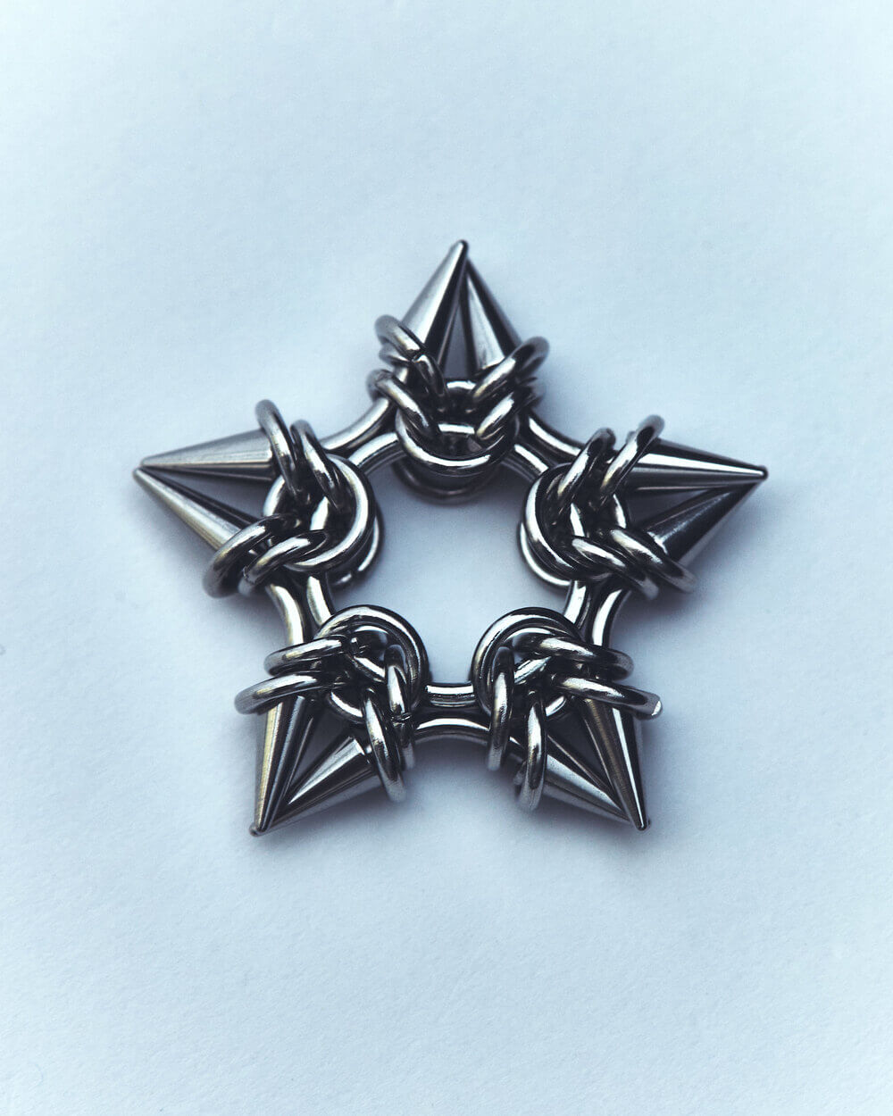 Mientras experimentaba con el material, viendo un tutorial de YouTube sobre cómo hacer una estrella con argollas, llegó ese momento donde algo hace clic en mi, adapté el tejido, incorporé cierres con piercings y terminé creando una estrella de cinco puntas hecha completamente a partir de tensión y bloqueos. Era literal una estrella, funciona a nivel técnico, visual y simbólico. Fue un “full circle moment”, una forma propia, que podía convertirse en un ícono dentro del imaginario de SIMBOLIC.