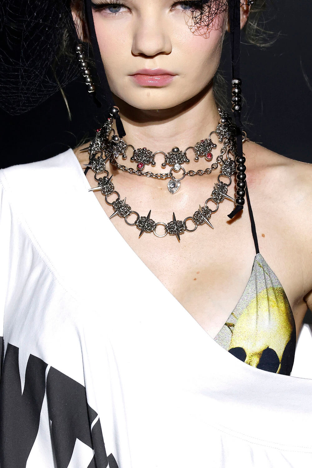 Todo comenzó hace un poco más de dos años, una tarde en la que con César estábamos reorganizando la habitación donde guardaba materiales de producción y vestuario. La idea era reutilizar lo que ya teníamos, en especial un traje de silicona lleno de cientos de piercings en todas las terminaciones. Partimos jugando con una cadena de base y mezclando cuentas de acrílico y vidrio, intentando armar collares para personajes ficticios de futuras producciones.