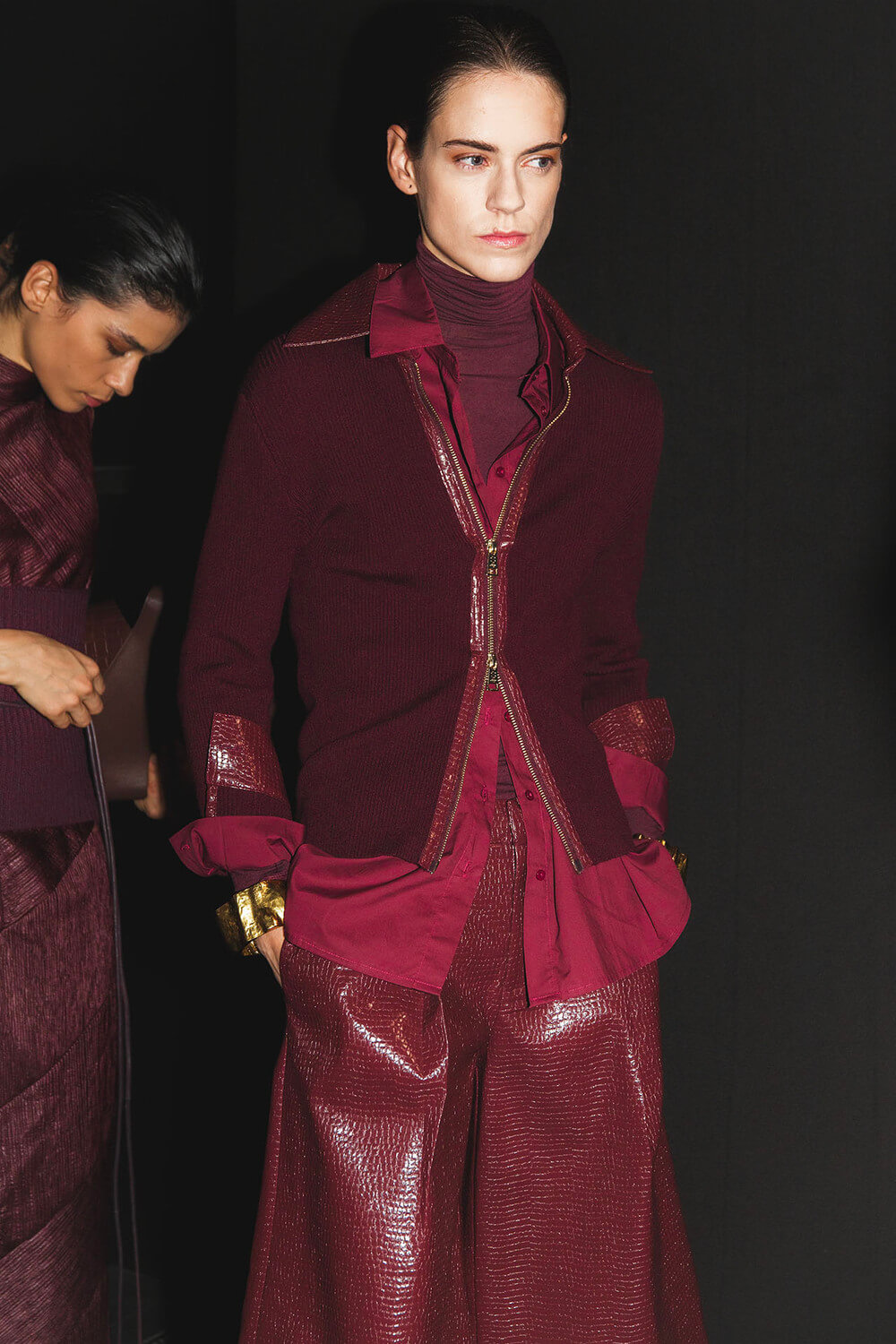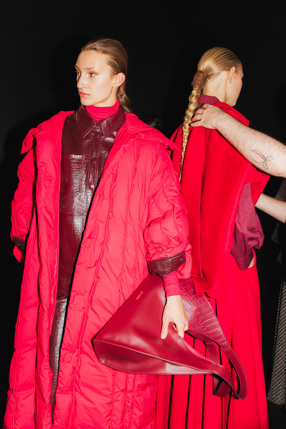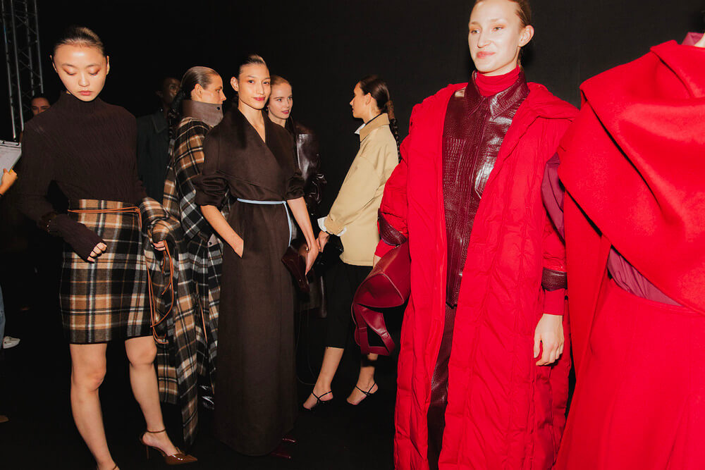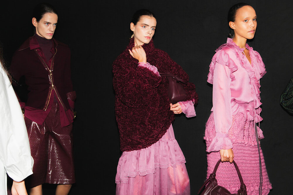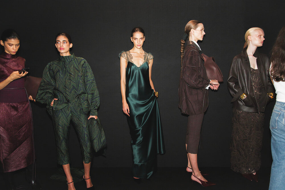 Textures reference the underground world — bark-like jacquards, double-faced wools, brushed effects that feel almost alive. A print of intertwined roots drifts across vaporous fabric, while black — organic, irregular, tactile — anchors the palette. Around it, tones of earth and oxidation: deep wine, moss green, navy, rust, dust, and a hint of skin.