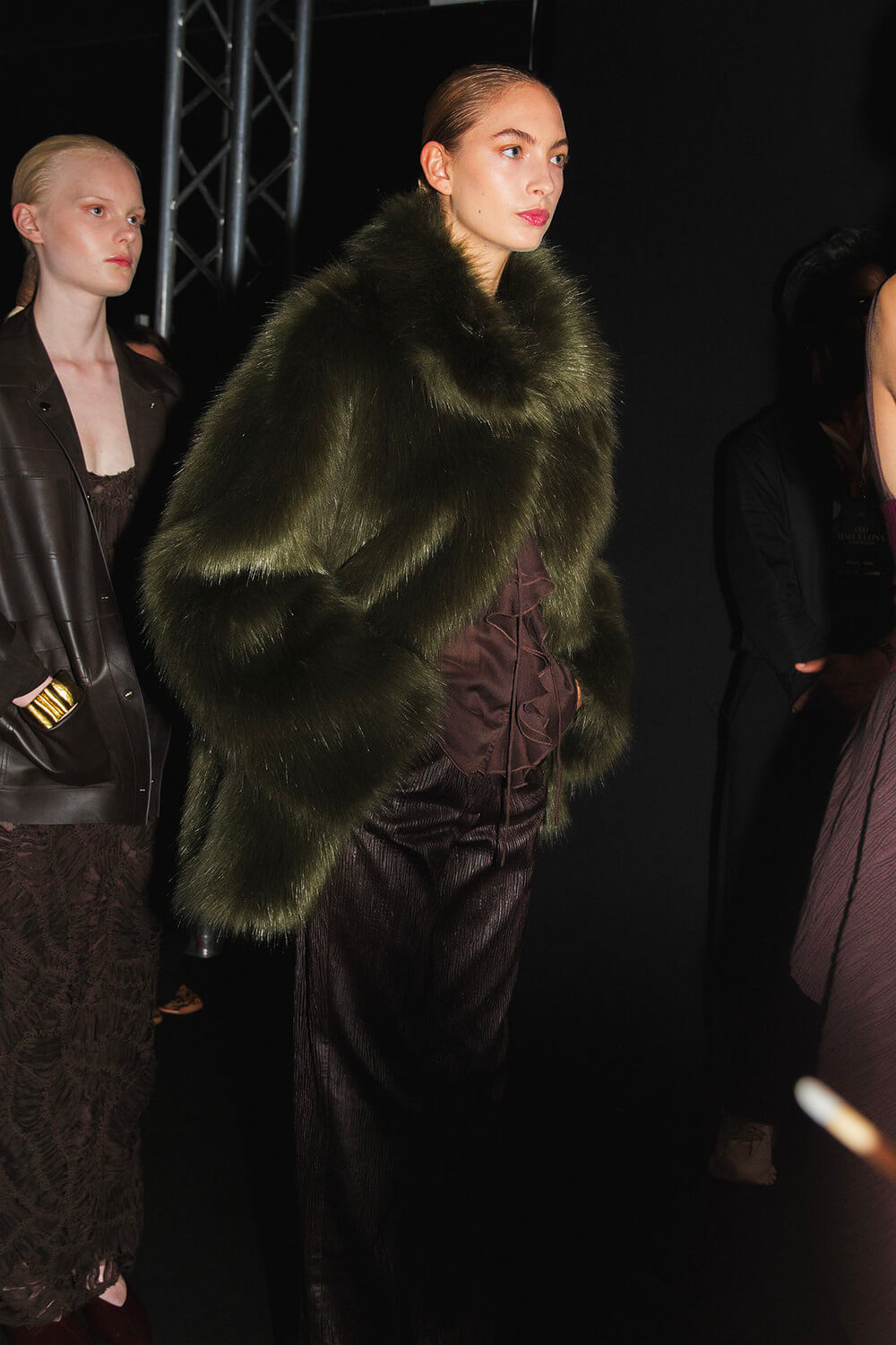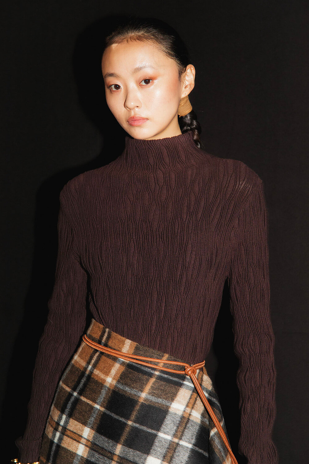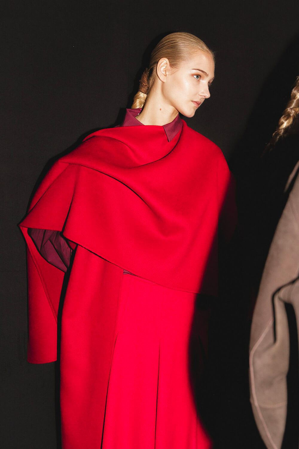 Textures reference the underground world — bark-like jacquards, double-faced wools, brushed effects that feel almost alive. A print of intertwined roots drifts across vaporous fabric, while black — organic, irregular, tactile — anchors the palette. Around it, tones of earth and oxidation: deep wine, moss green, navy, rust, dust, and a hint of skin.