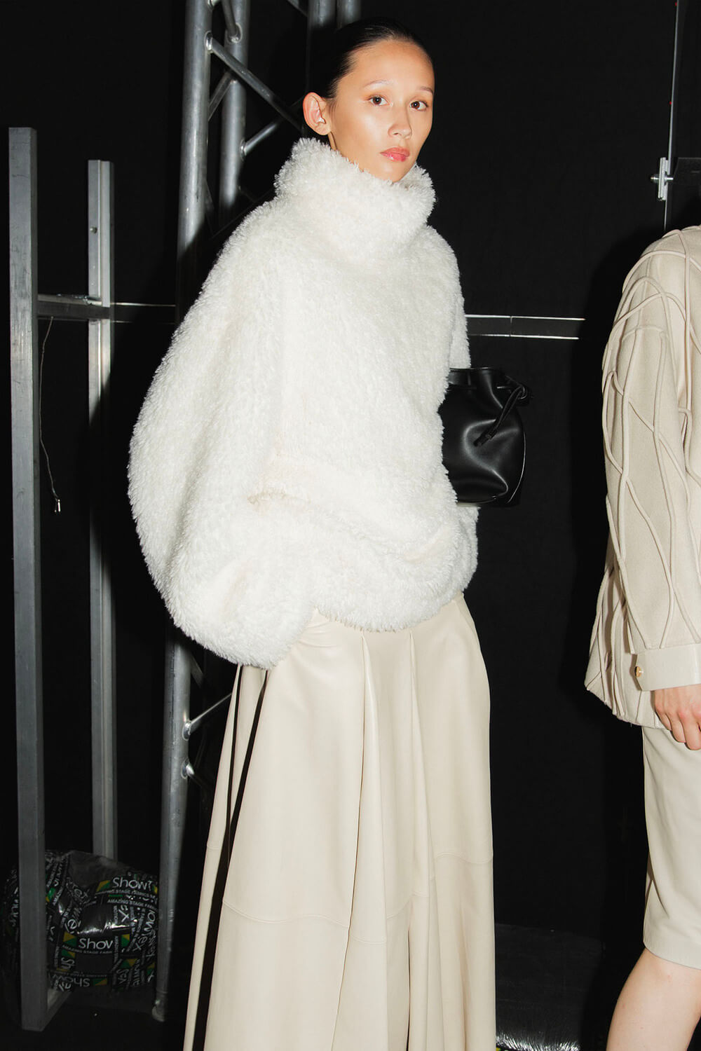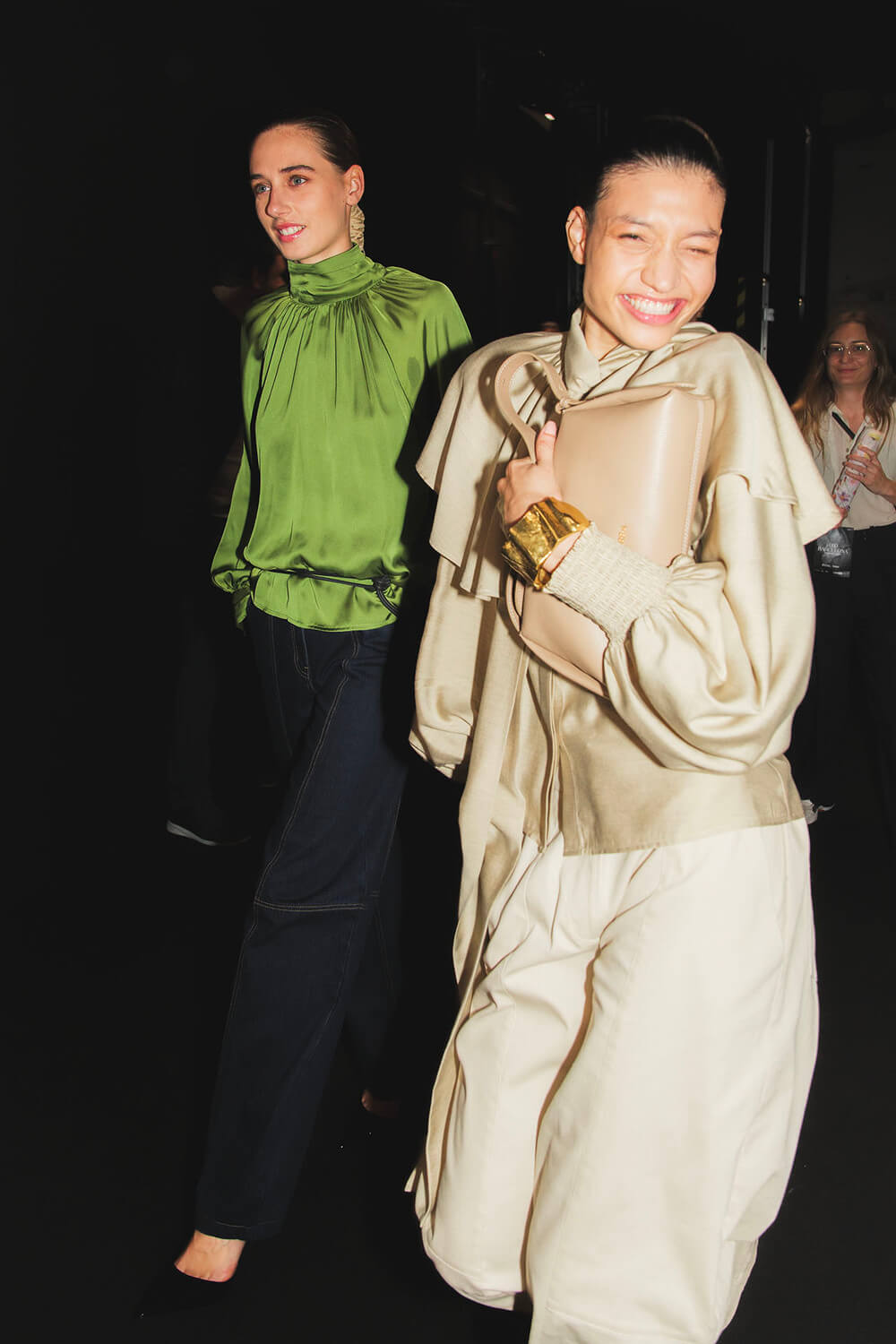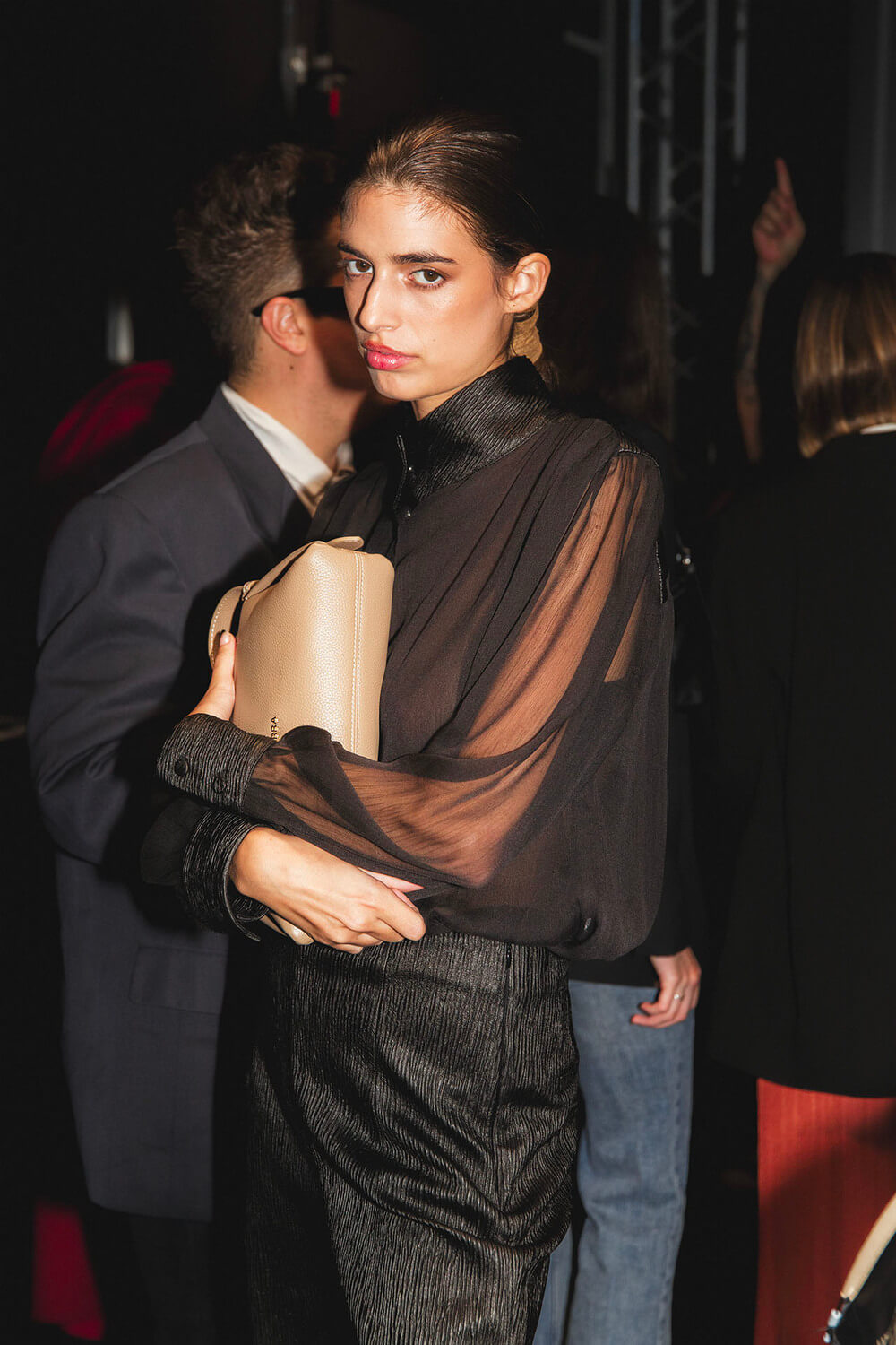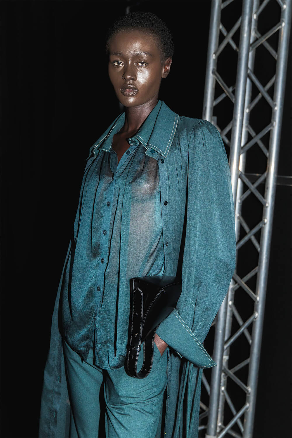 The silhouettes pulse with contrasts — sculptural shoulders over narrow lines, generous volumes cinched by knitted belts, translucent shirts layered like sediment. There’s an instinctual choreography between softness and structure, as if each look were breathing.
