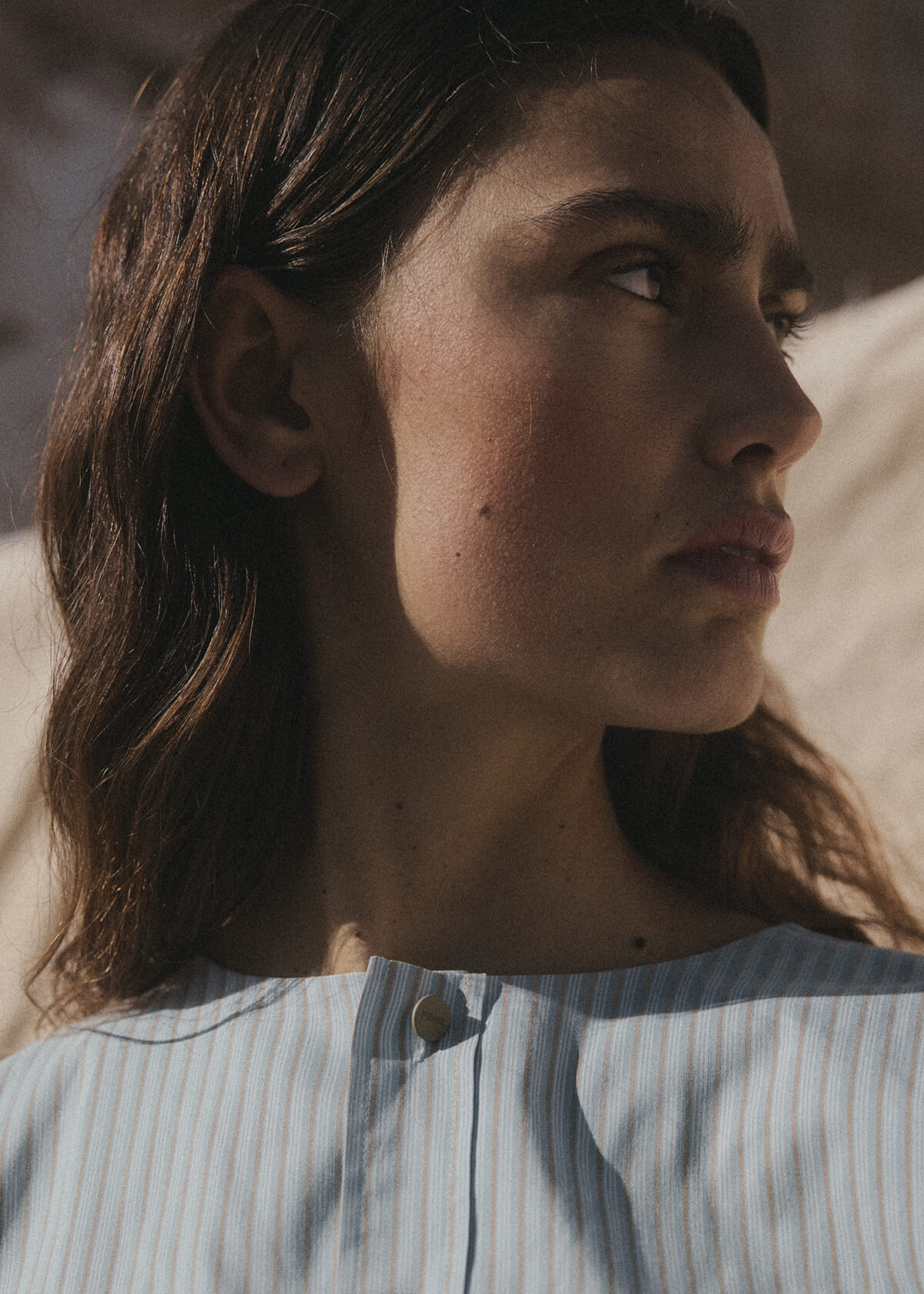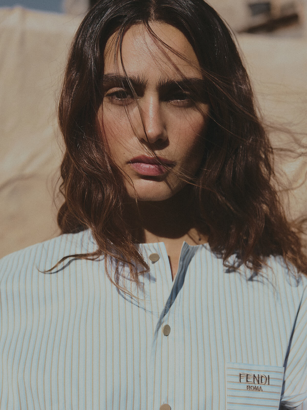 The earth tilts, the season fractures. Elena holds both: light that never fades, clothes that clash and converge. Fall appears in the dissonance, precise, fragile, unyielding. Featuring looks from Fendi, Acne, Maje, Loewe among vintage, the series blends documentary rawness with an editorial, timeless aesthetic.