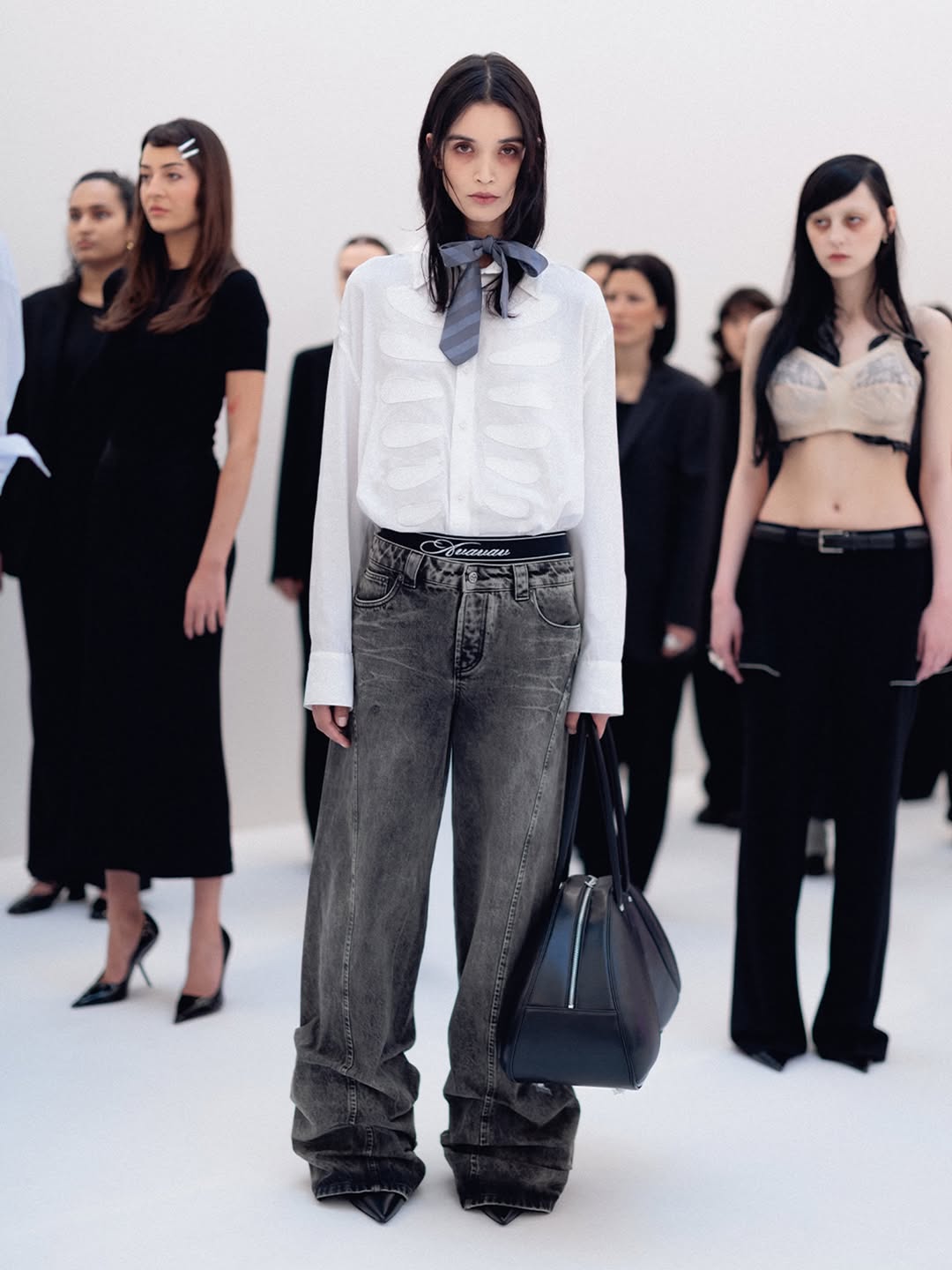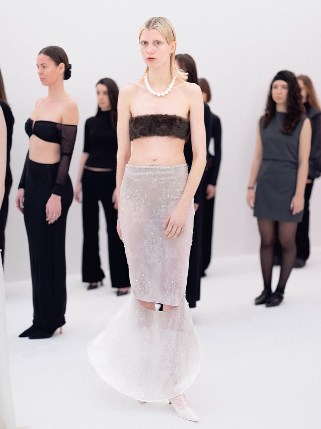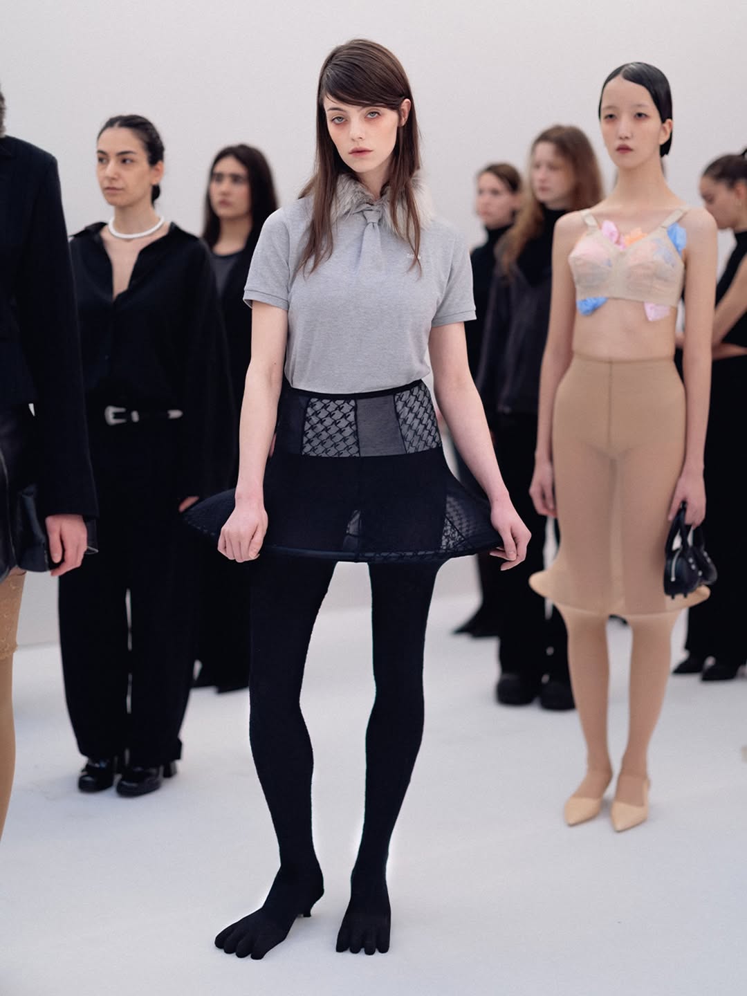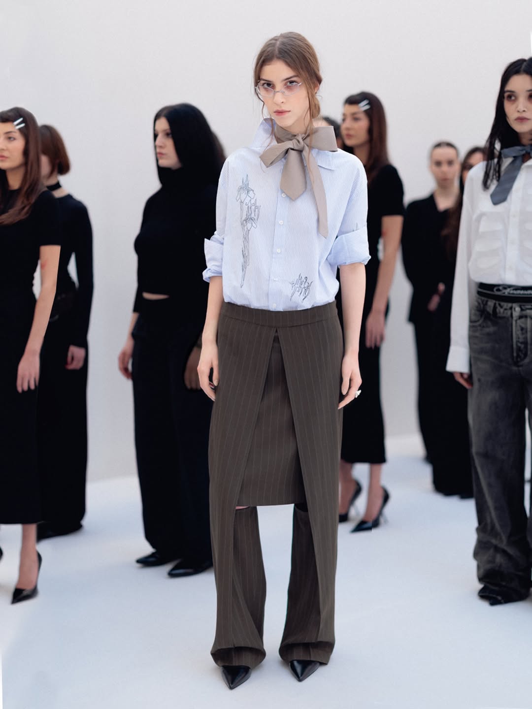 The choreography of the show followed that same logic. Instead of walking a catwalk, the models stood along the sides of the room wearing the collection while observing the audience moving through the space. The familiar hierarchy of runway and front row dissolved, and the act of looking itself became part of the performance.