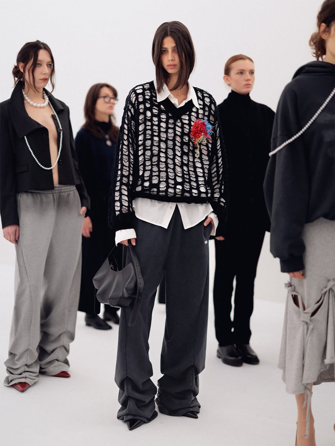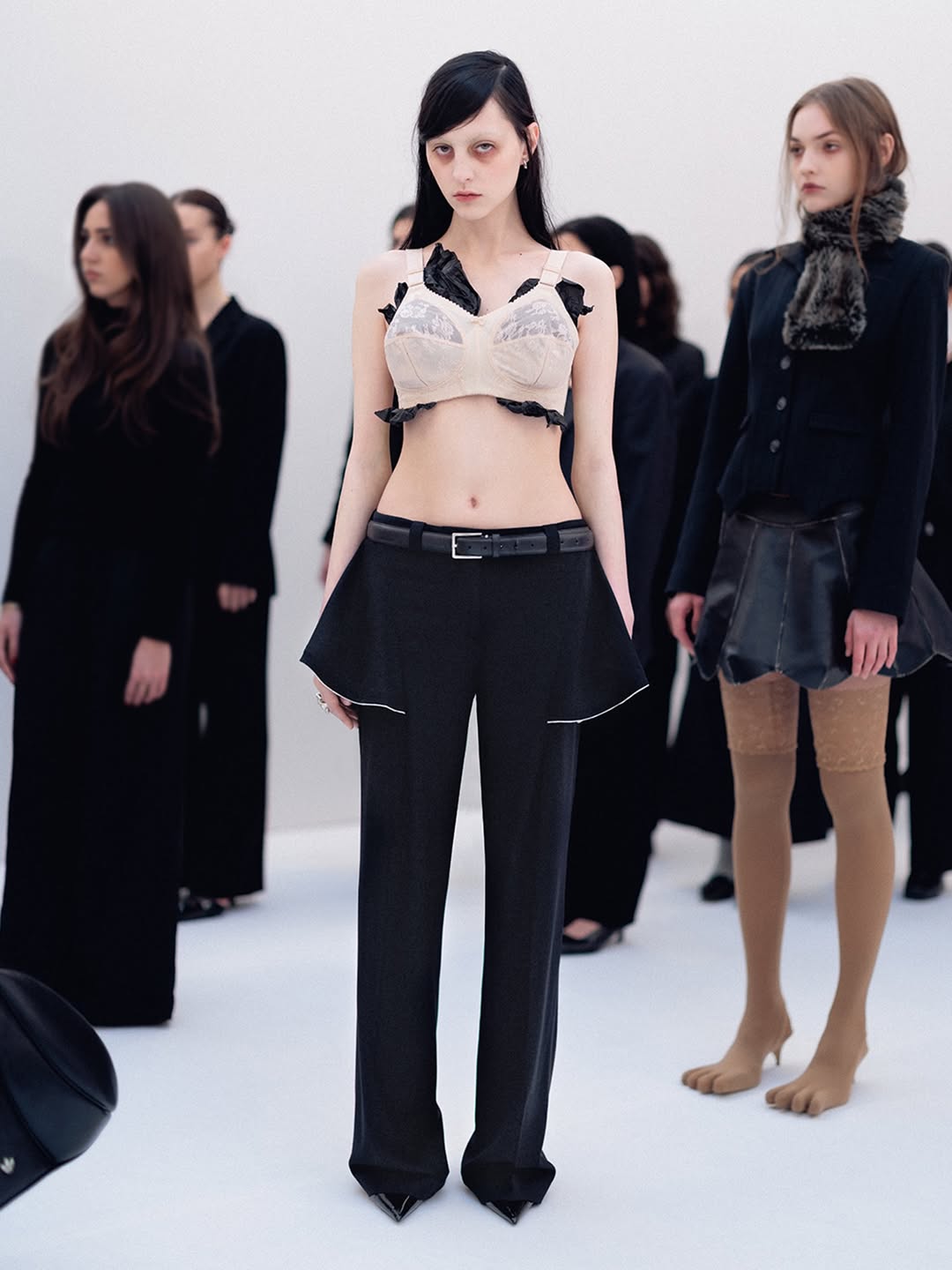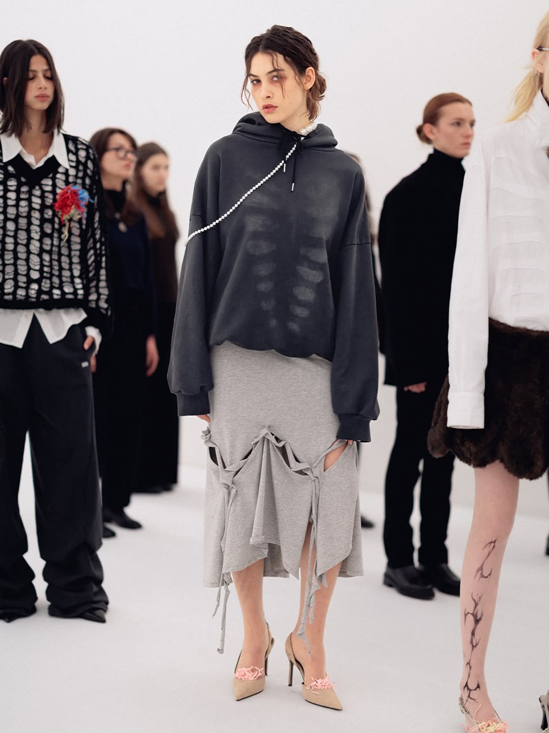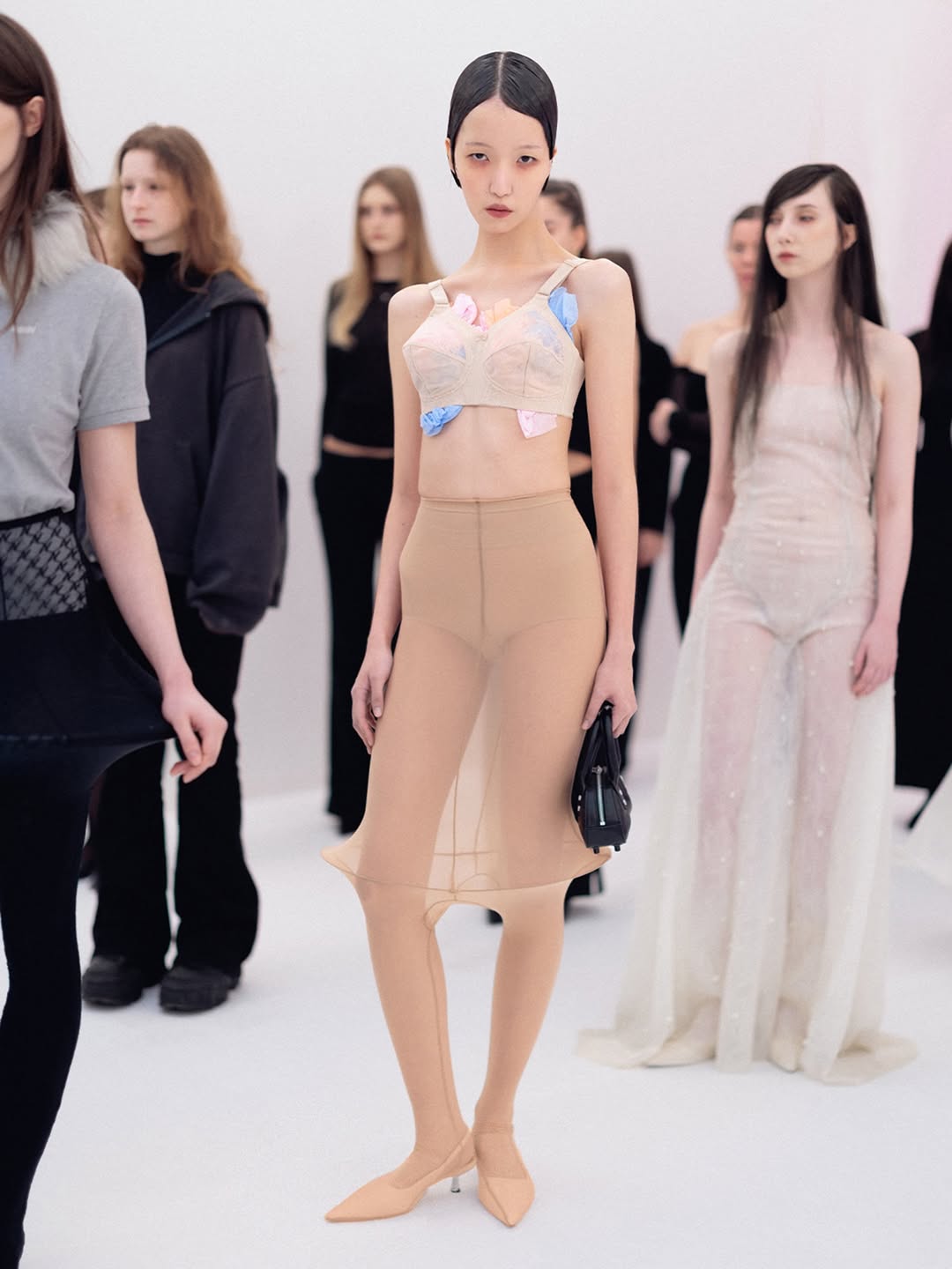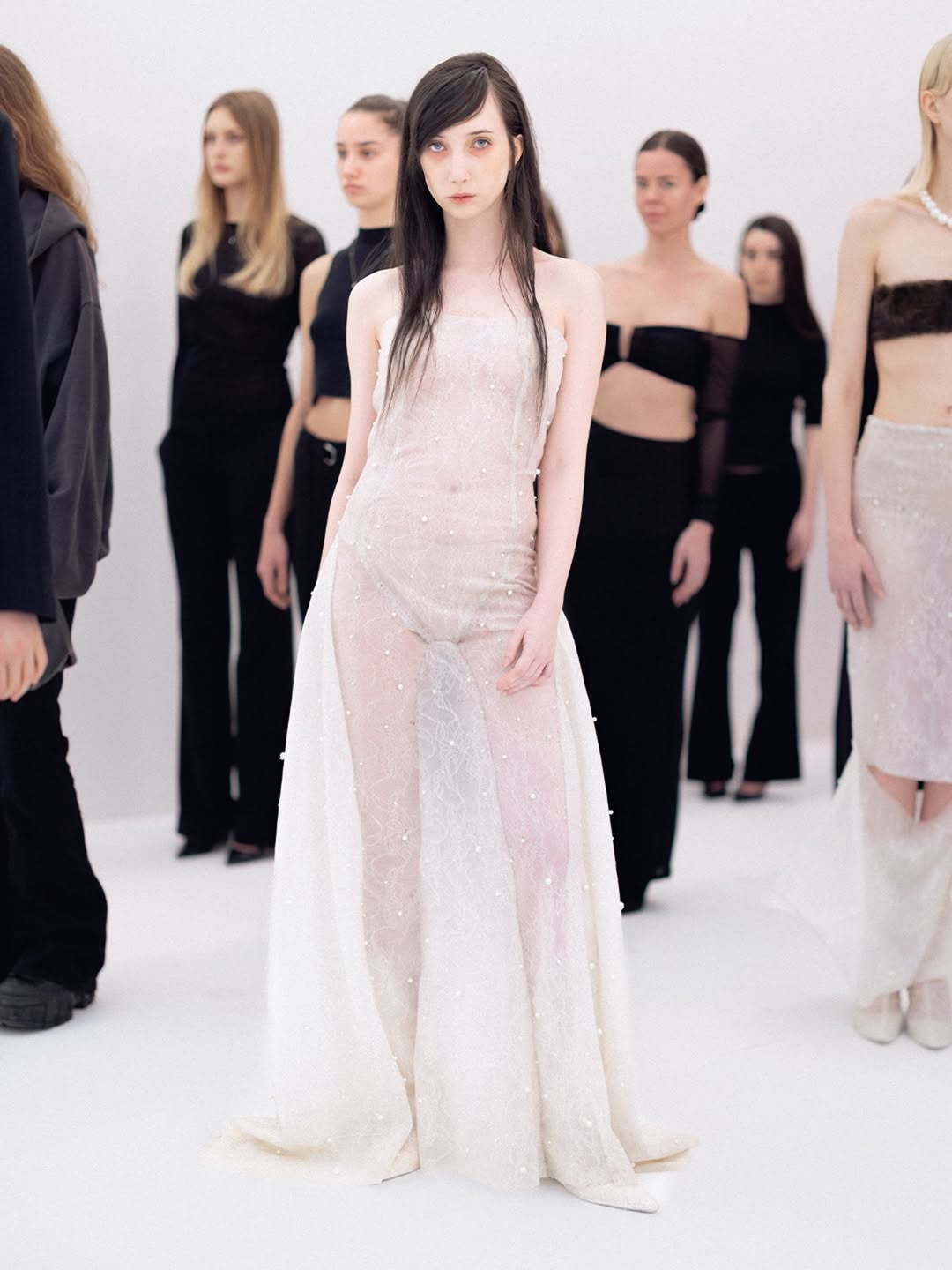 The choreography of the show followed that same logic. Instead of walking a catwalk, the models stood along the sides of the room wearing the collection while observing the audience moving through the space. The familiar hierarchy of runway and front row dissolved, and the act of looking itself became part of the performance.
