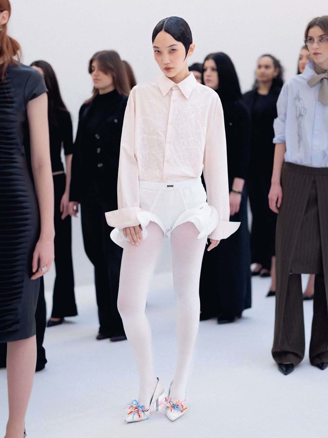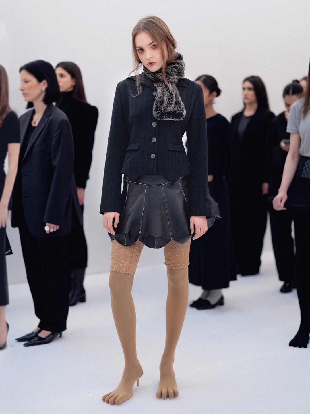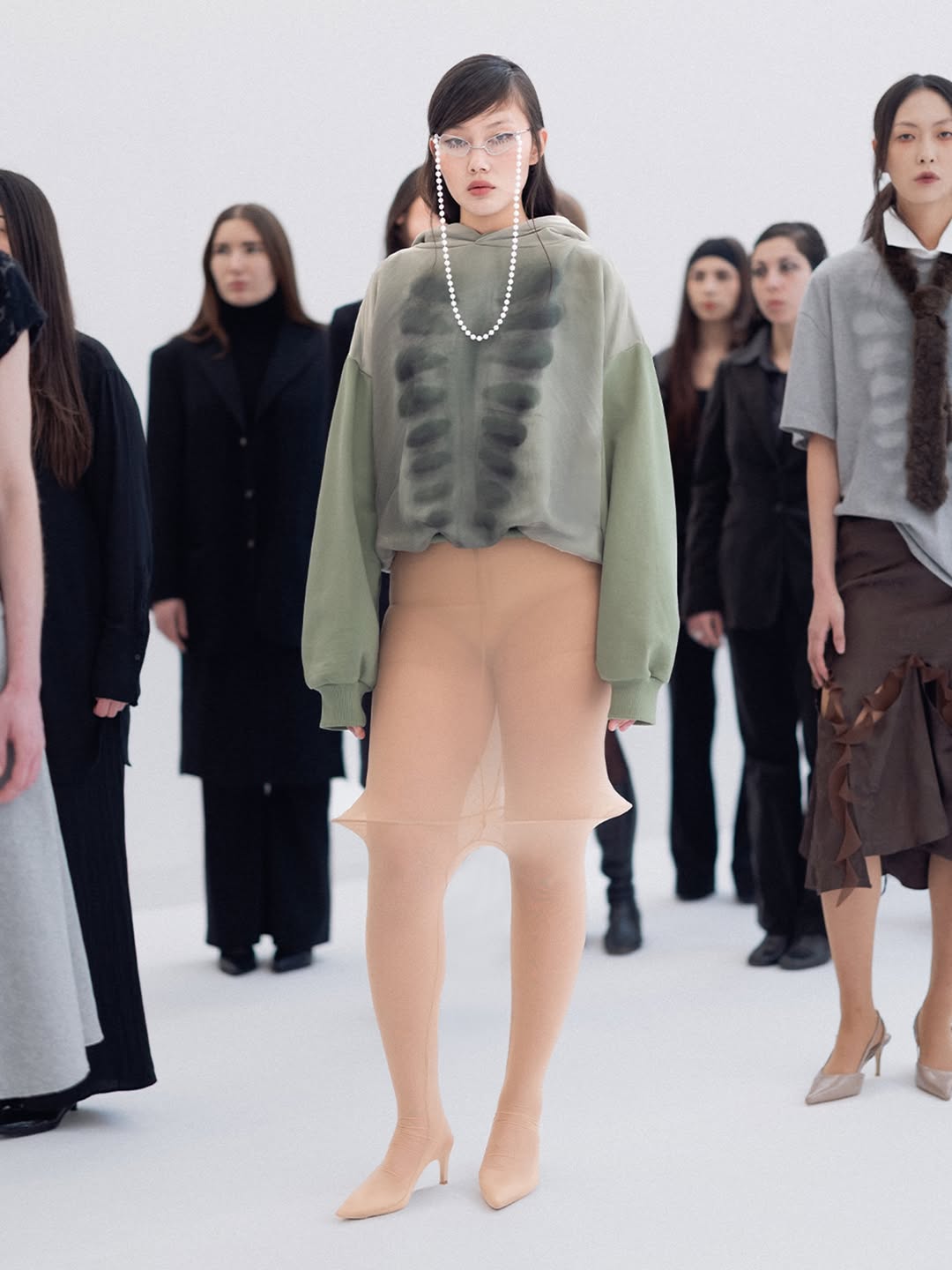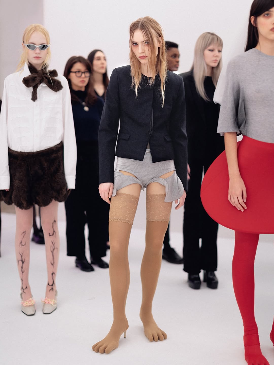 The choreography of the show followed that same logic. Instead of walking a catwalk, the models stood along the sides of the room wearing the collection while observing the audience moving through the space. The familiar hierarchy of runway and front row dissolved, and the act of looking itself became part of the performance.