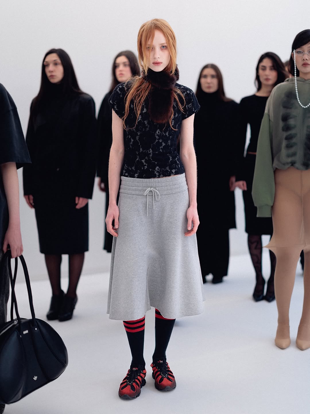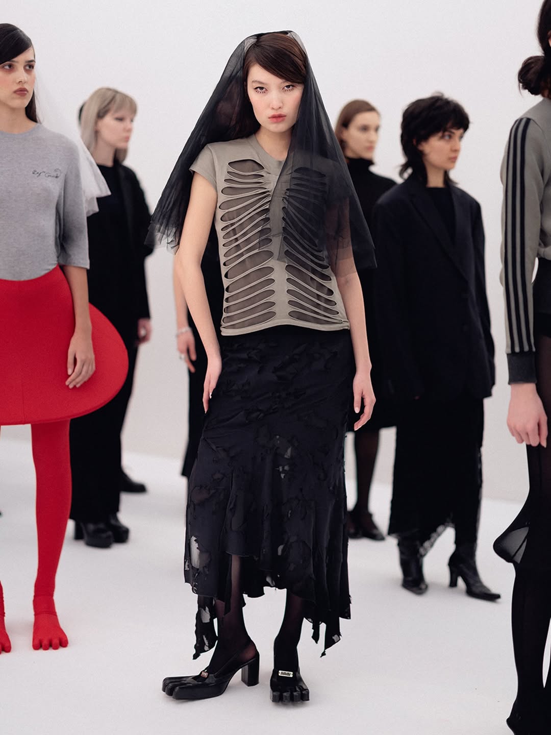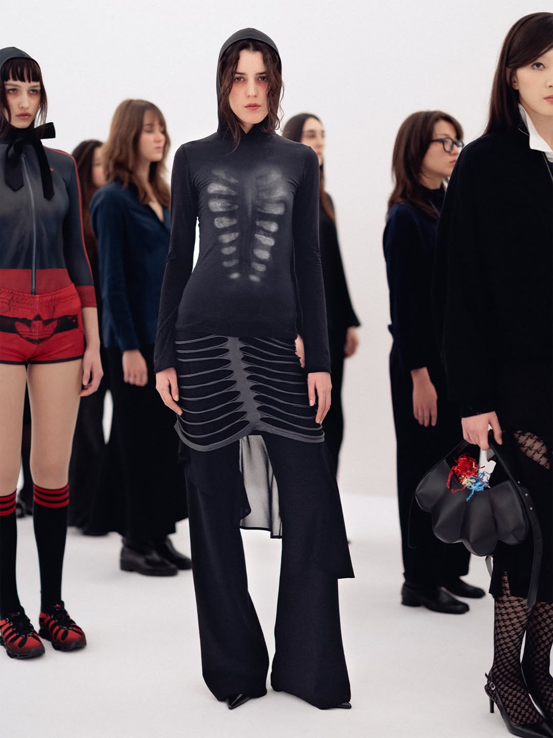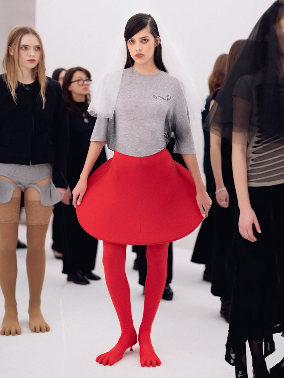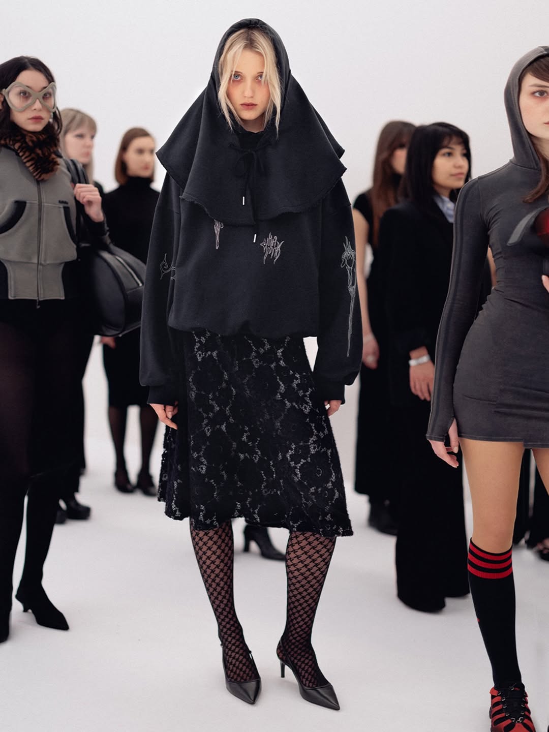 The choreography of the show followed that same logic. Instead of walking a catwalk, the models stood along the sides of the room wearing the collection while observing the audience moving through the space. The familiar hierarchy of runway and front row dissolved, and the act of looking itself became part of the performance.