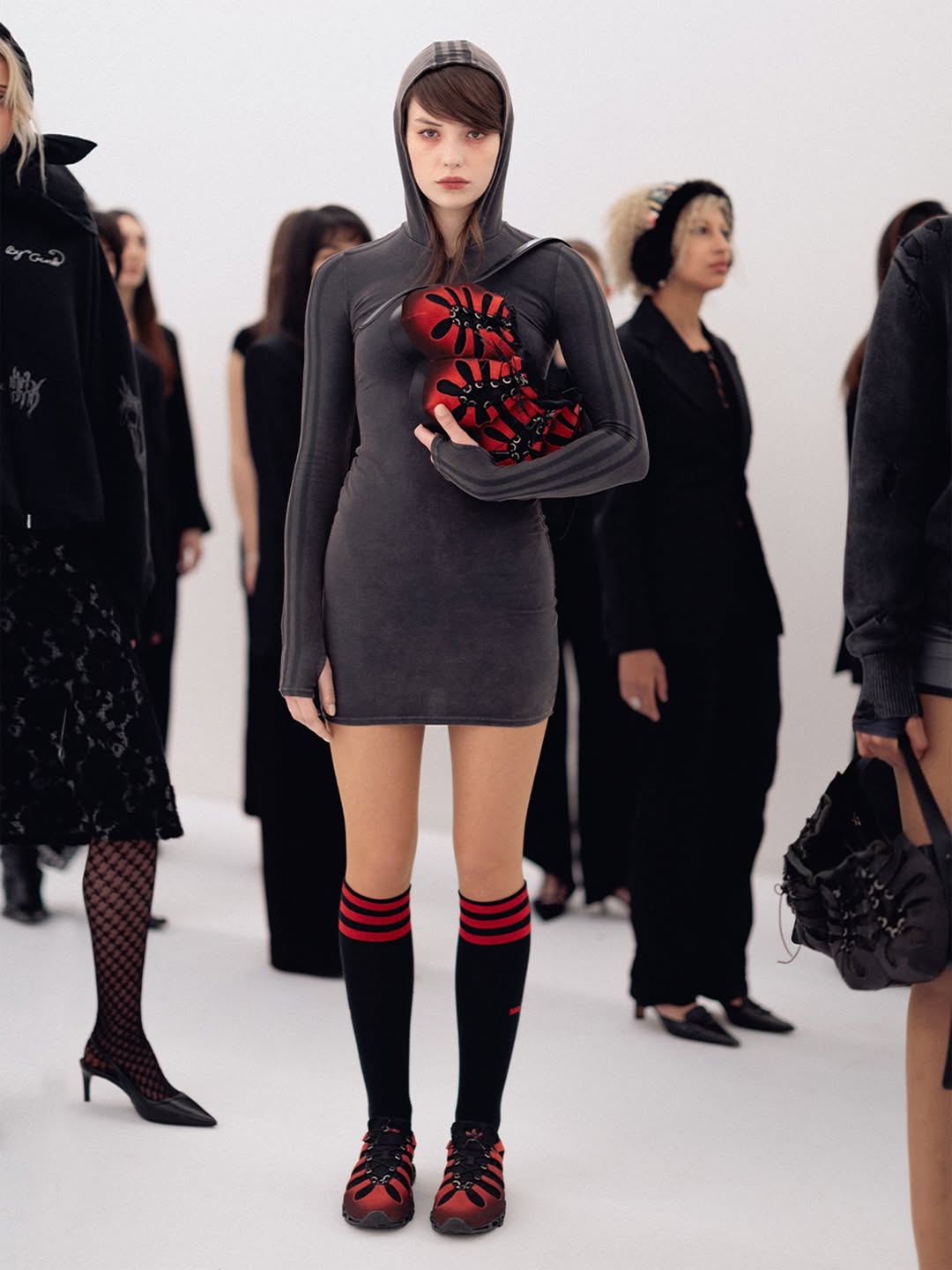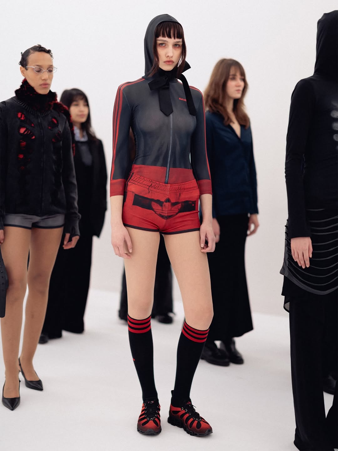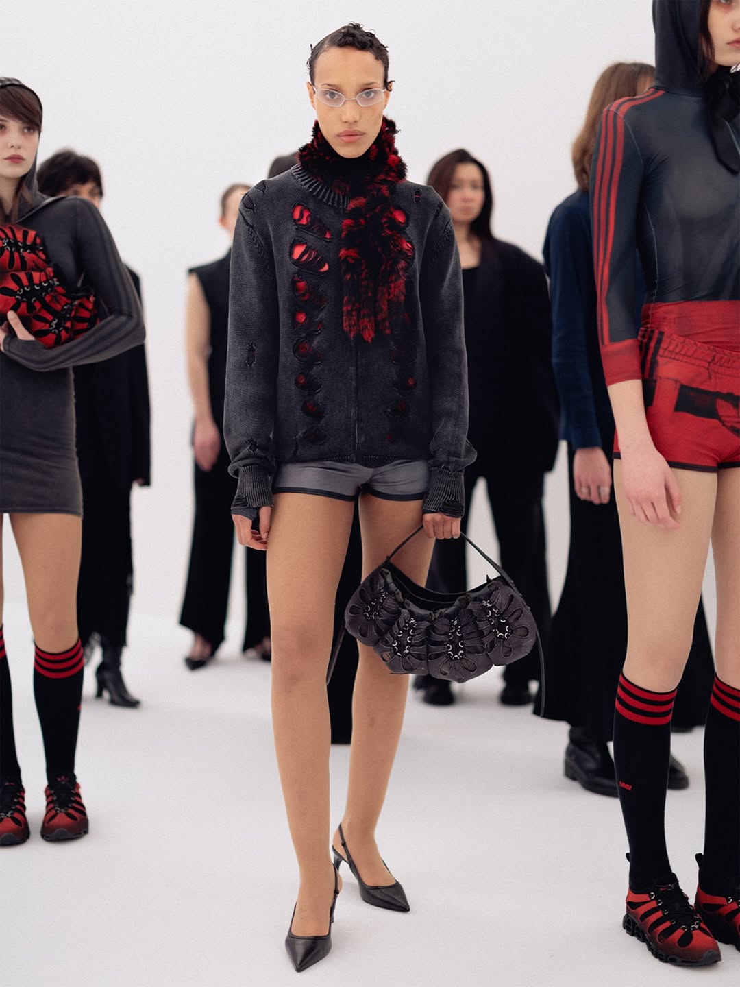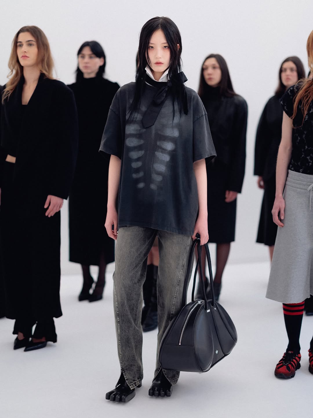 The choreography of the show followed that same logic. Instead of walking a catwalk, the models stood along the sides of the room wearing the collection while observing the audience moving through the space. The familiar hierarchy of runway and front row dissolved, and the act of looking itself became part of the performance.