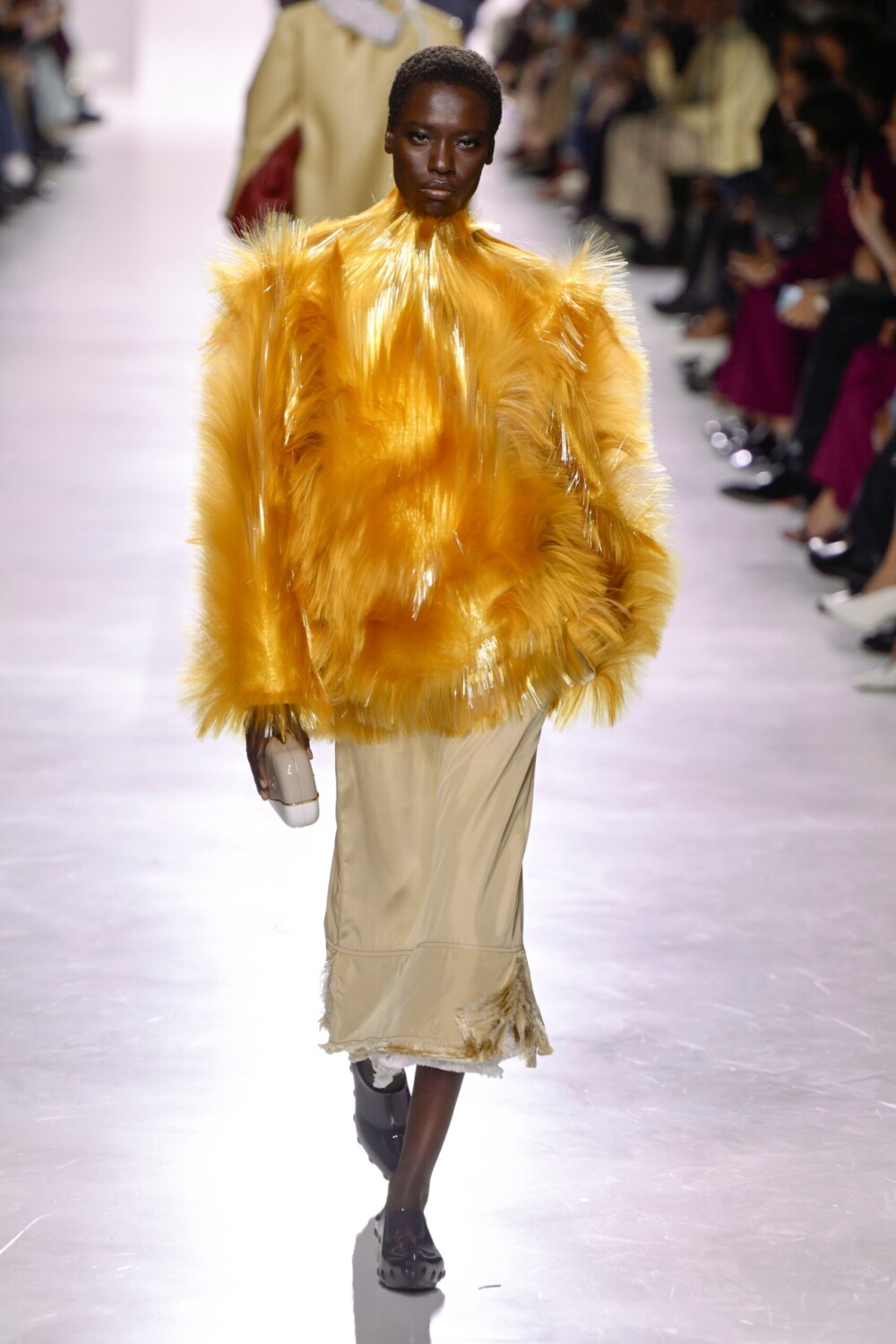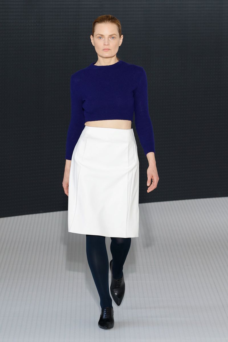 Yet the strength of her proposal lies in mastering the brand’s DNA and in elevating fabrics and textures to starring roles. The intrecciato—the iconic leather-strip weaving technique developed in the 1960s—appeared in multiple applications: coats, dresses, collars, scarves, and bags. Among the most innovative materials was recycled fiberglass, sourced from industrial waste, used in sweaters and skirts. It offered an alternative to animal fur and brought a new dimension of sustainability to luxury.