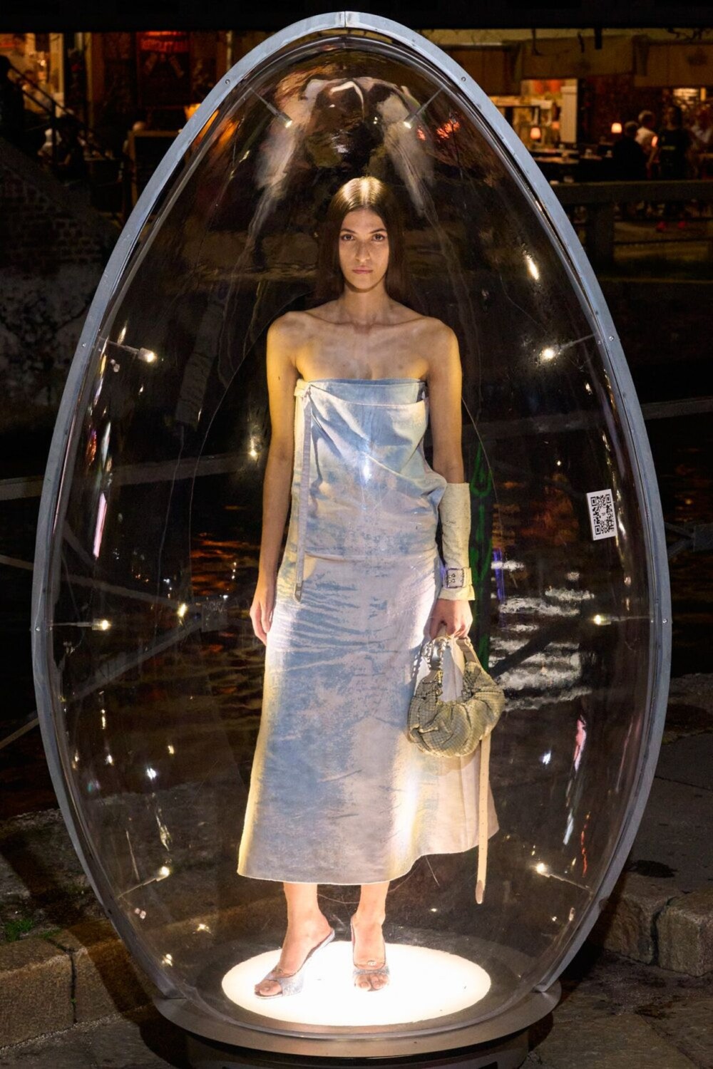 Glenn Martens adapted the staging to the brand’s codes. To do so, he reinterpreted the iconic acrylic eggs from Jurgi Persoons’ Paris presentation in 2001, transforming them into a large-scale urban experience, with models enclosed in eggs scattered throughout the city.