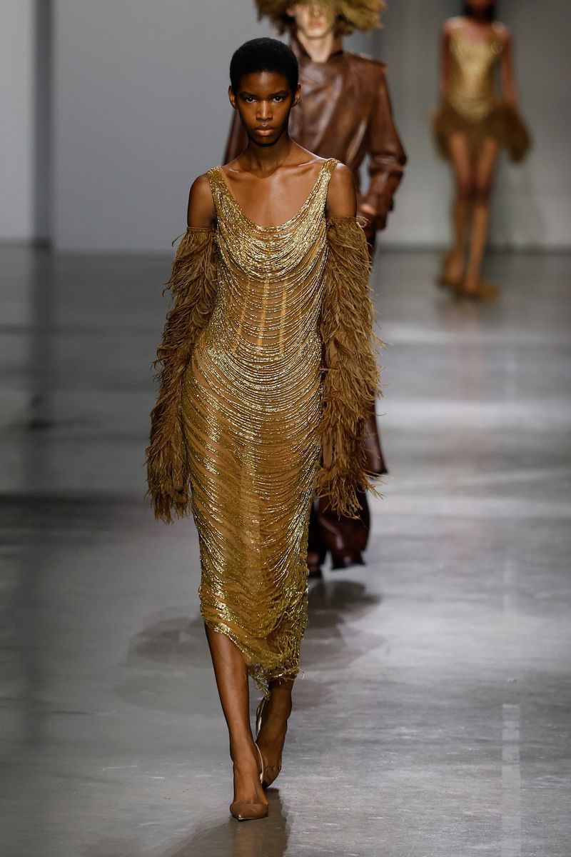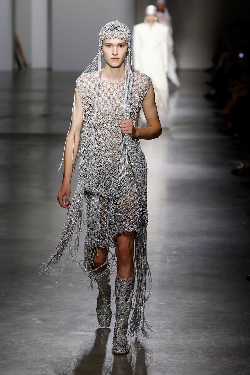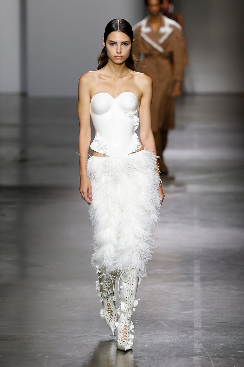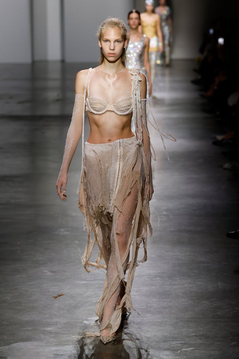 The myth materialized in resin bustiers molded to the body, draping imitating wet fabric, sweaters and lace with embedded pearls or crystals, ethereal feathers, and even metallic wings evoking Icarus.