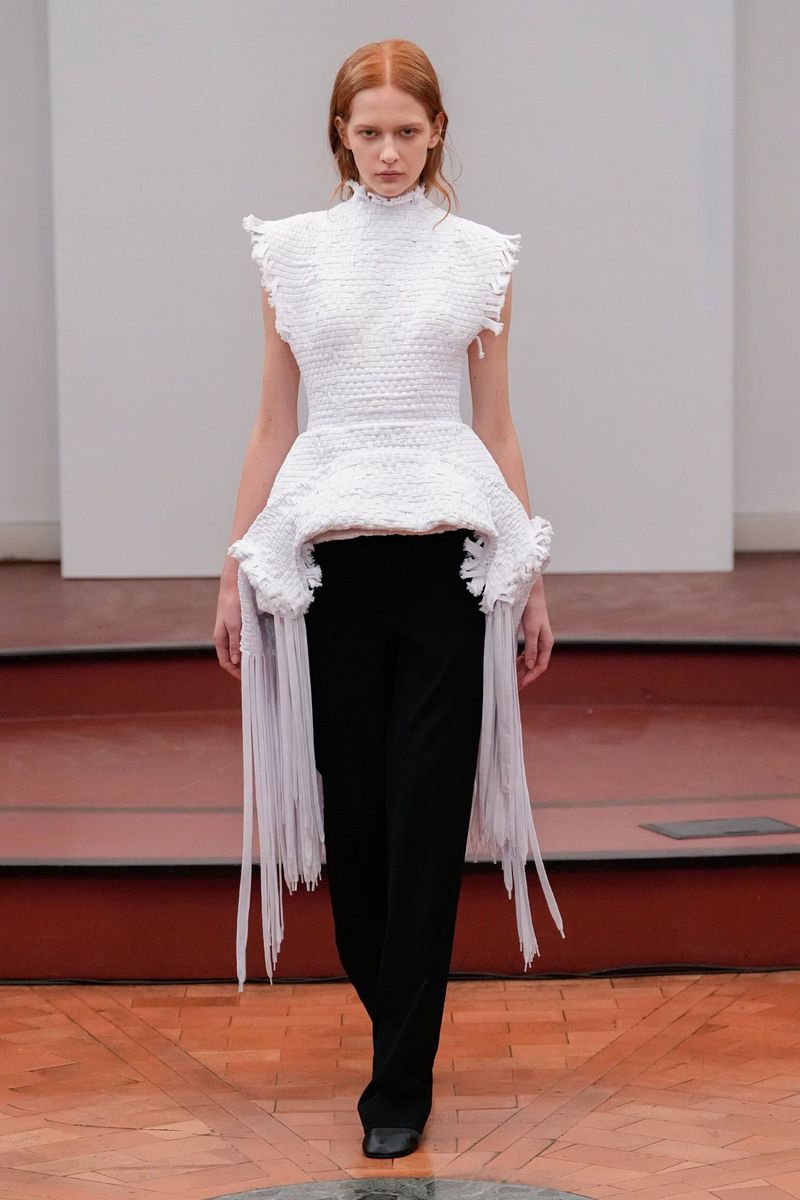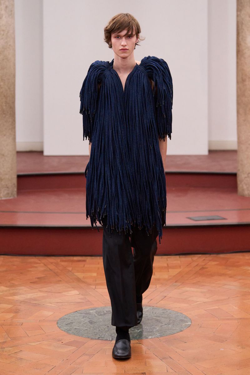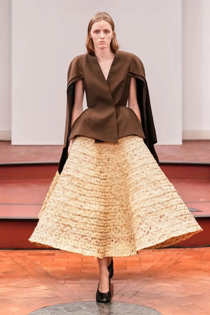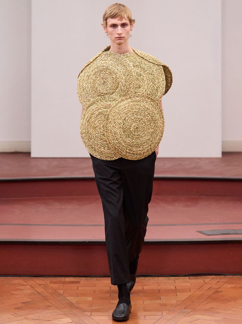 Each garment seems more like a sculpture than something to wear: voluminous peplum tops, pieces constructed with denim cords—an experimental and sustainable reinterpretation of the material, part of the S|STYLE DENIM LAB project by Fondazione Sozzani—or woven reed pieces, crafted by a community of 13 artisans who still master this tradition.