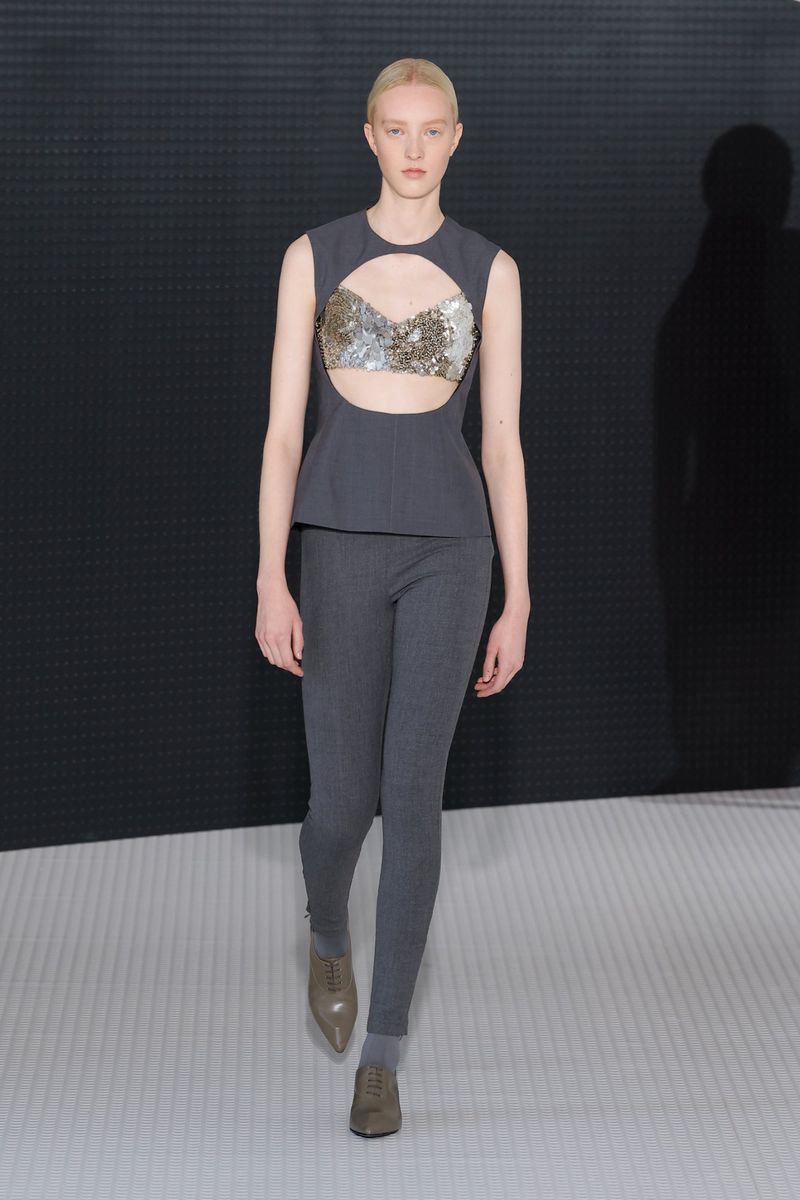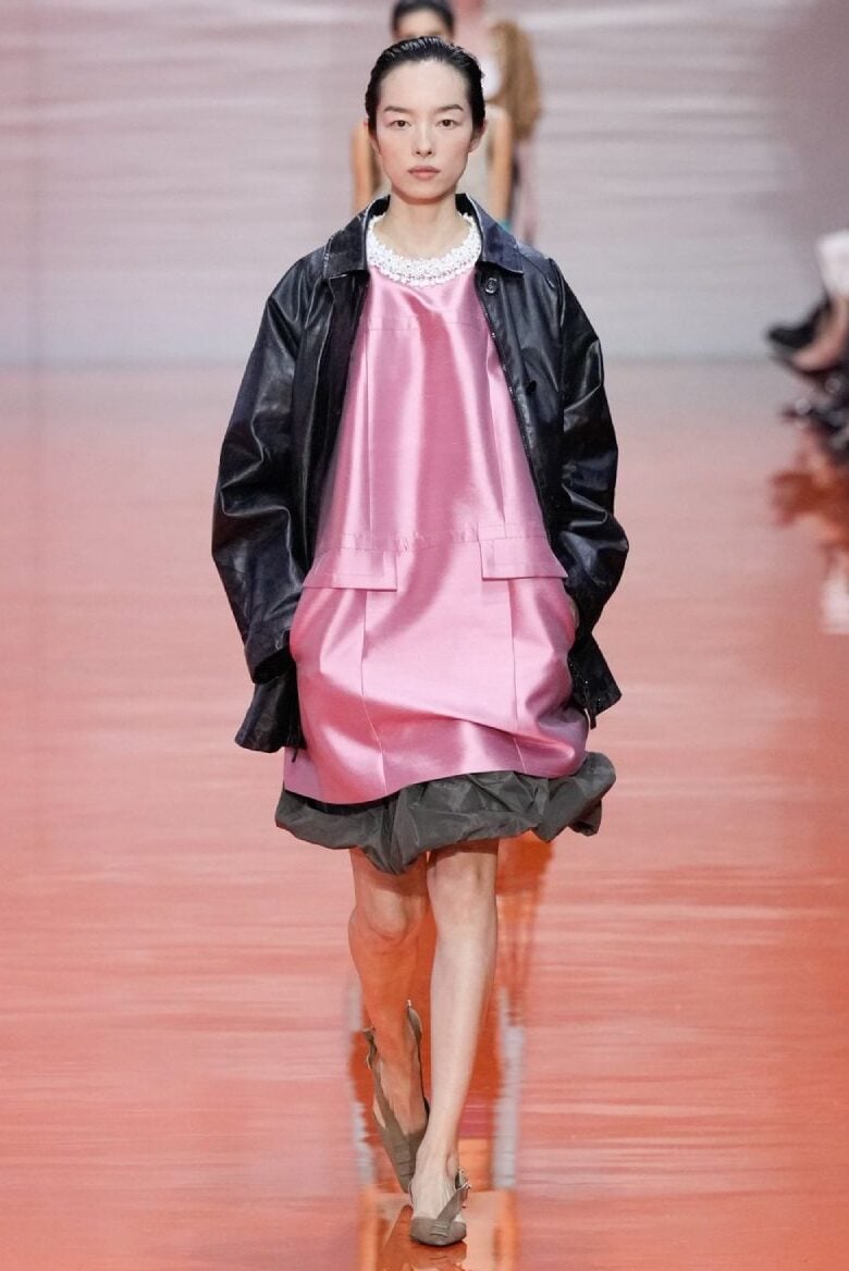 The collection is enriched by a play of textures and constructions: satin midi dresses with balloon skirts, overlays resembling the skeleton of a skirt placed over more structured ones. The color palette—varied but not flashy, with black and gray as central axes—set the pace on the runway.