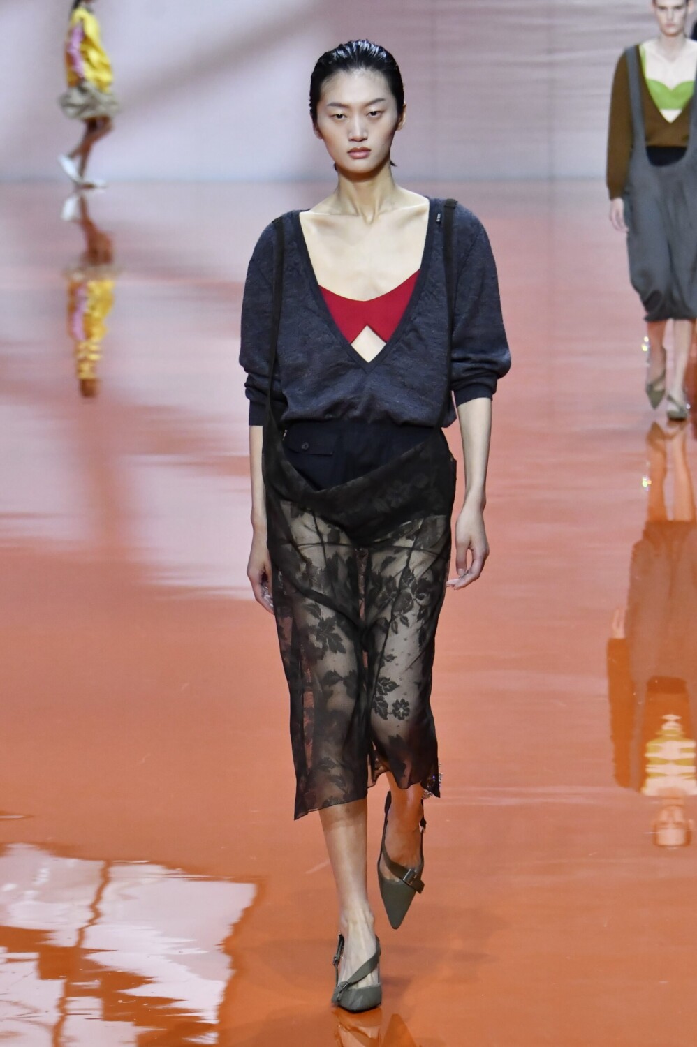 The collection stood out for its richness in textures, guided by the concept of the “inner animal.” Leather skirts with irregular edges, chiffon frayed at the shoulders, trompe-l’oeil sweaters held together only by open seams—dialoguing with double-layer garments that revealed interiors, altering silhouettes and creating depth. Denim was another field of experimentation: bleached and laser-treated to simulate wear, applied to dresses, jackets, and coats with deconstructed straps.