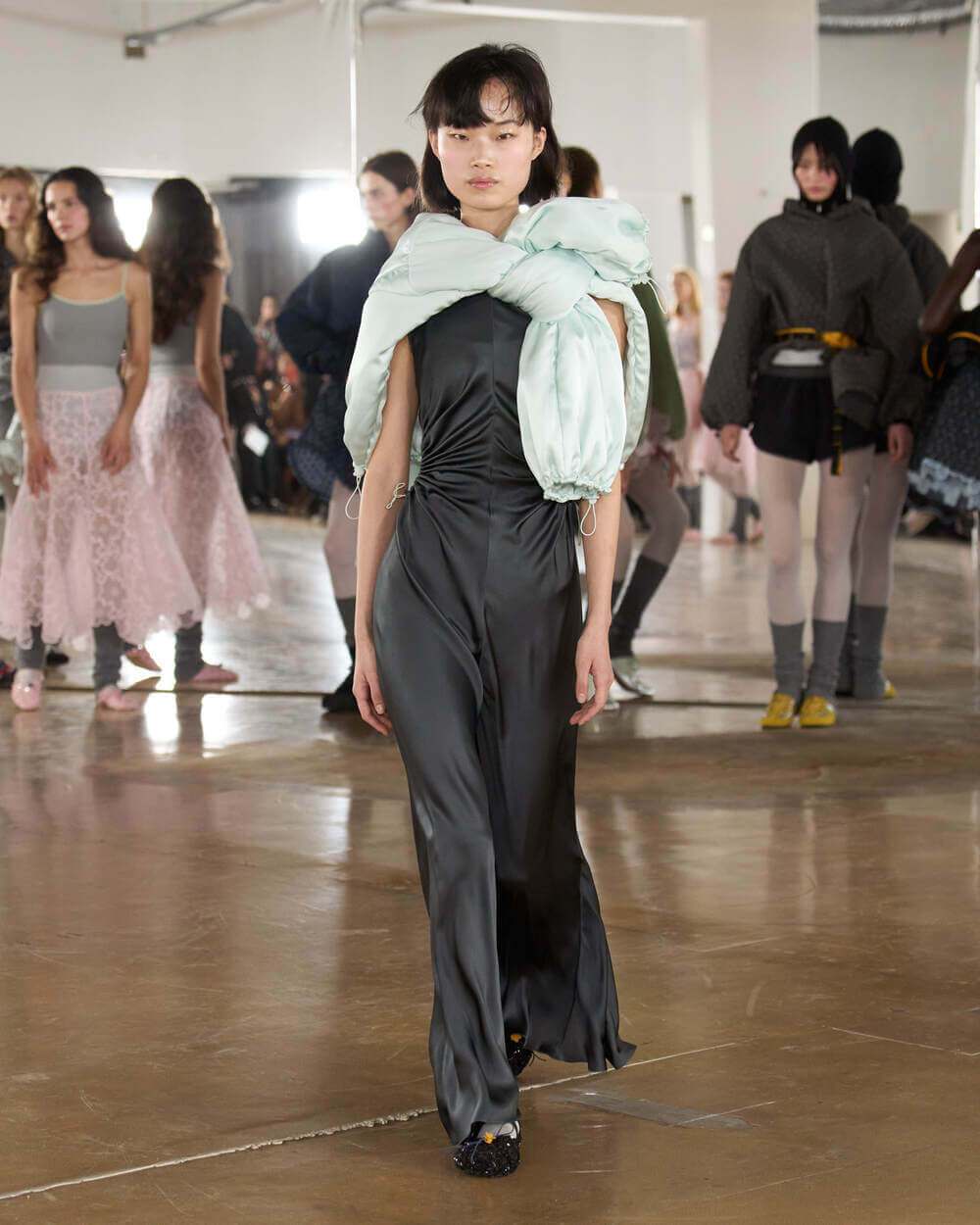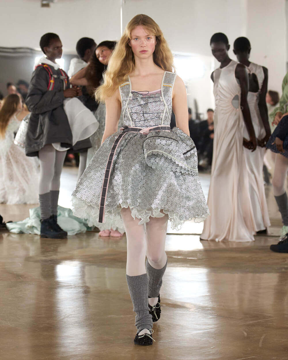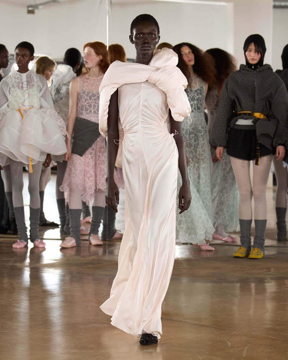 “I called this collection Practice because I don’t view practice as something that comes before mastery, it is the work itself. It’s the repetition, the returning, the passion and the dedicated work of refining craft over and over again. In fashion, like in dance, you learn through doing – through pinning, unpicking, rehearsing, refining. The pieces are never truly finished; they evolve through patience and care. I also wanted to rethink the runway. Rather than a finished moment of perfection, we invite the audience into a rehearsal, something that feels honest and immediate. It is not only about the final moment, but about the rhythm, the exchange, and the energy that builds over time.” stated Cecilie Bahnsen.