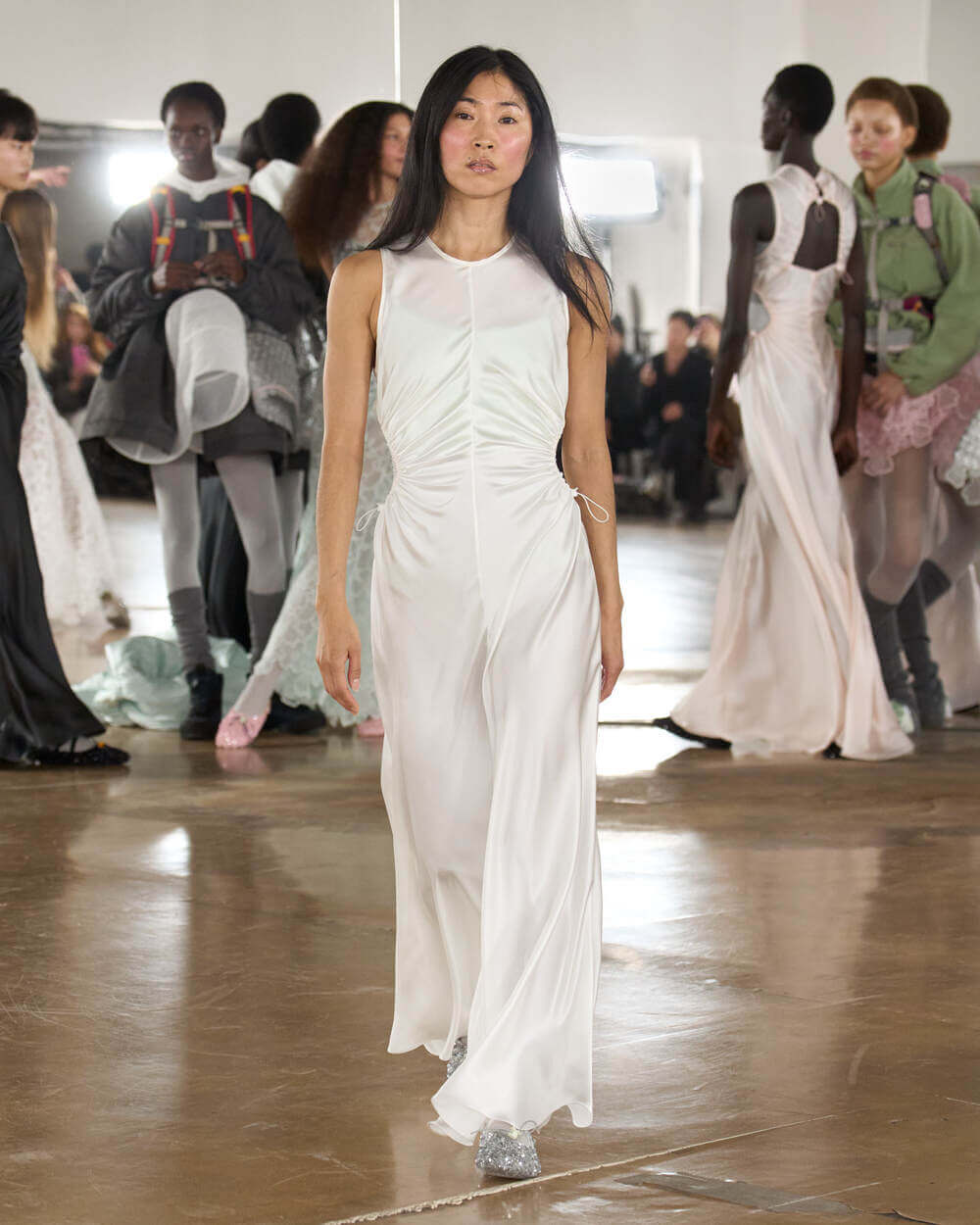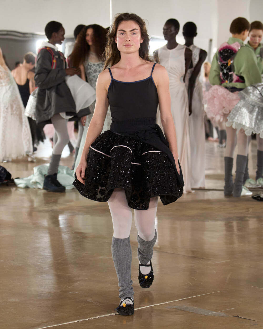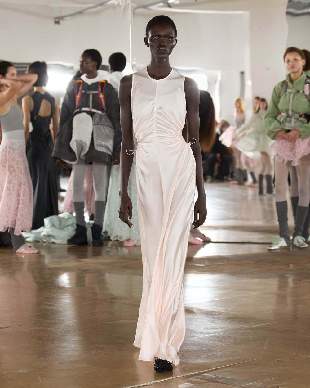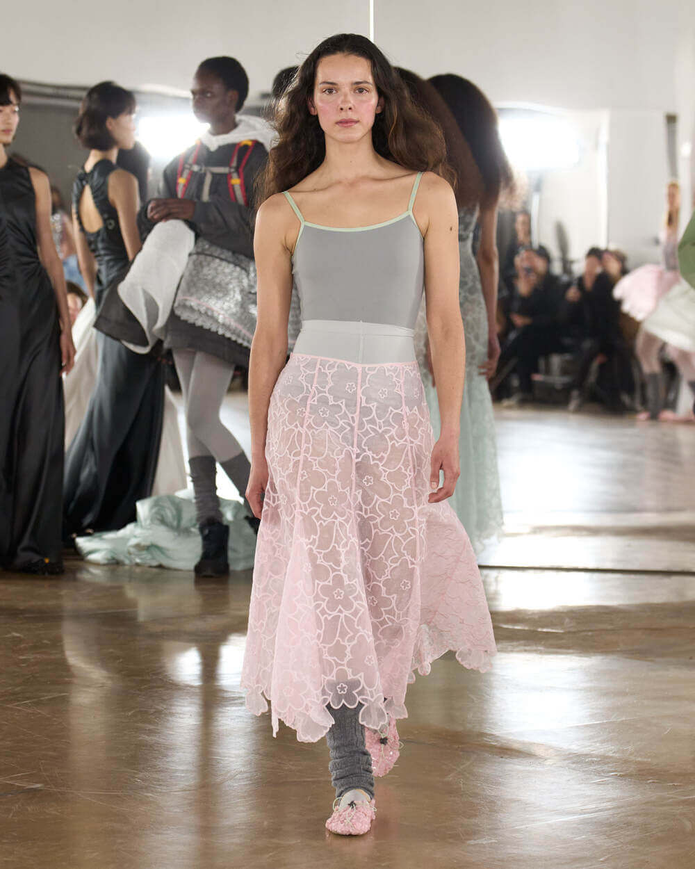 “I called this collection Practice because I don’t view practice as something that comes before mastery, it is the work itself. It’s the repetition, the returning, the passion and the dedicated work of refining craft over and over again. In fashion, like in dance, you learn through doing – through pinning, unpicking, rehearsing, refining. The pieces are never truly finished; they evolve through patience and care. I also wanted to rethink the runway. Rather than a finished moment of perfection, we invite the audience into a rehearsal, something that feels honest and immediate. It is not only about the final moment, but about the rhythm, the exchange, and the energy that builds over time.” stated Cecilie Bahnsen.