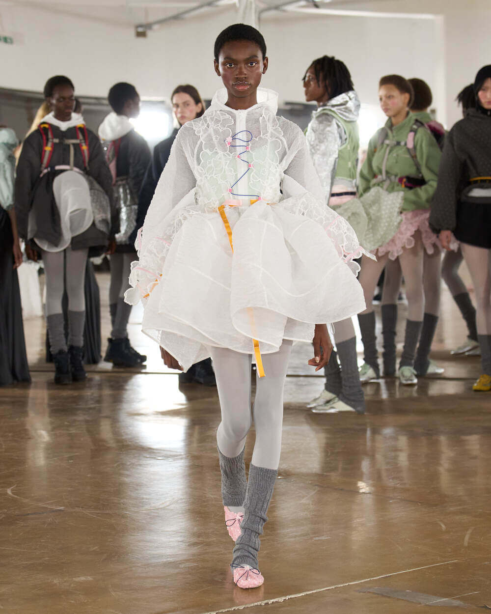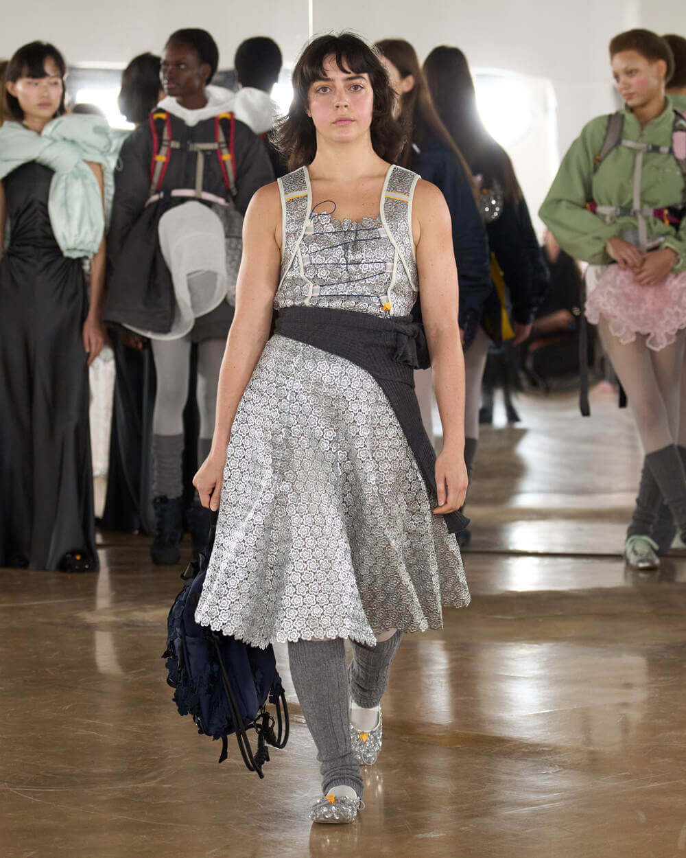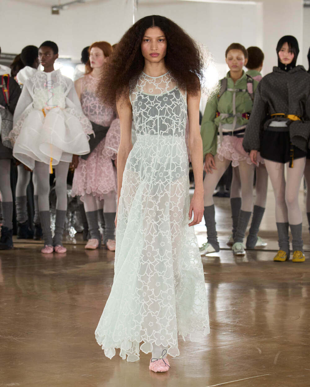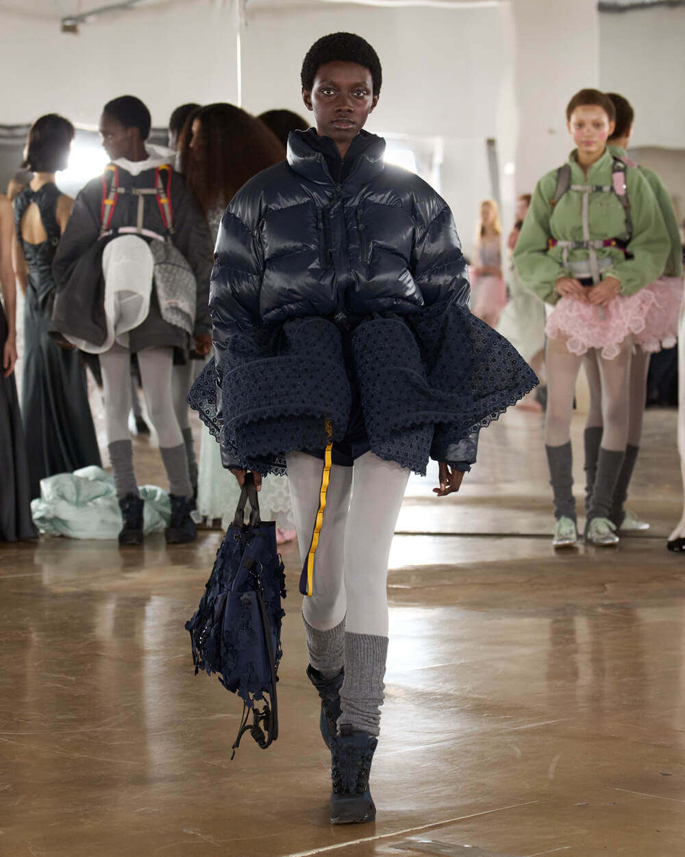 Couture met with ease as dancers stretched and warmed up where movement brought life to the pieces. Soft feminine elements were blended over technical performance items. Sculptural dresses paired with recycled nylon jackets balancing between functionality and style. With every movement we saw shape and bounce. Walking among the dancers were models in delicate anglaise reinterpreted on technological organza to create a perforated, couture-inspired fabric. We also saw Cecilie Bahnsen’s ongoing collaboration with The North Face including a romantic viewpoint reimaging bags using iconic silhouettes from the archive.