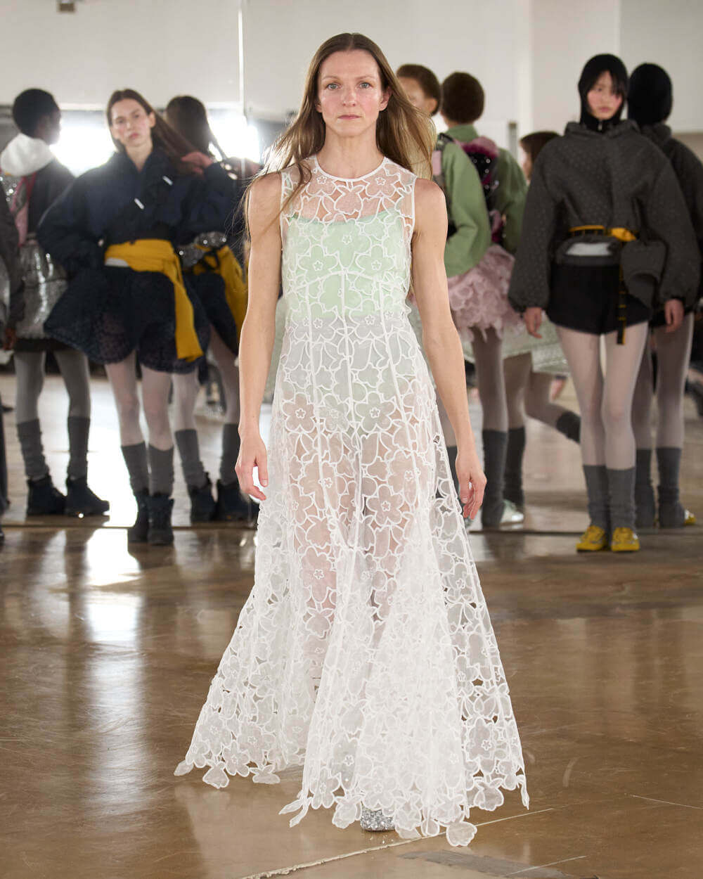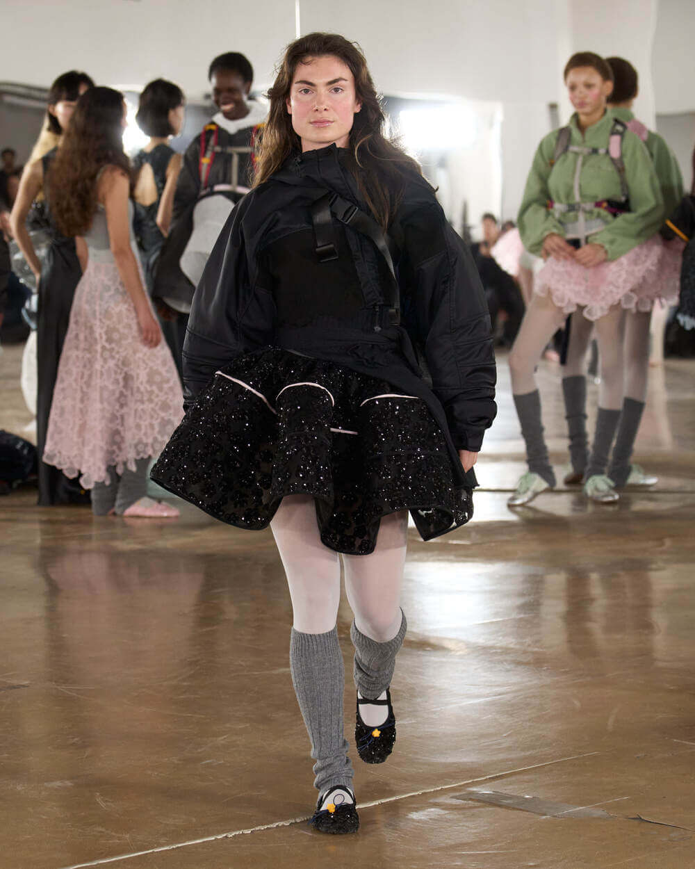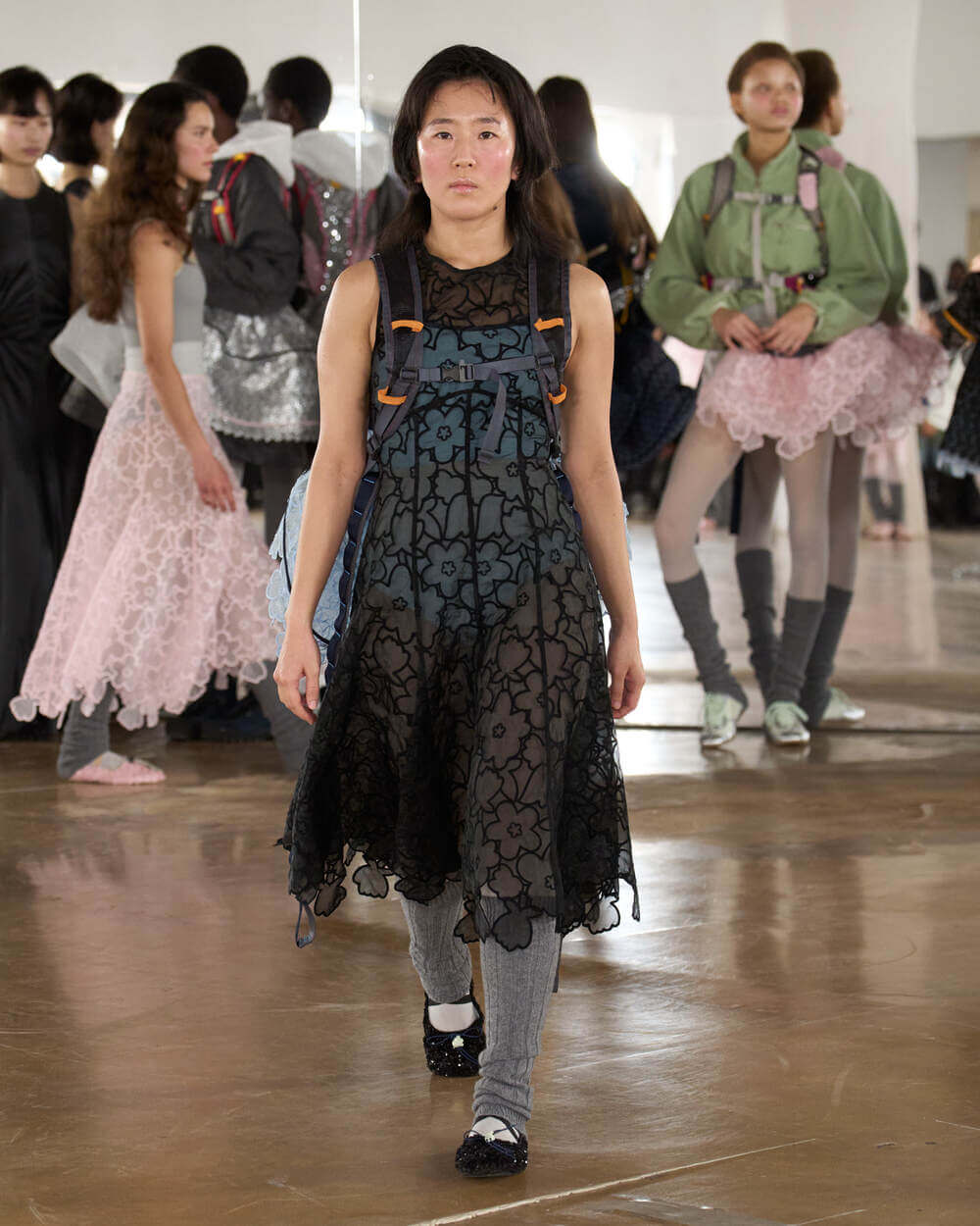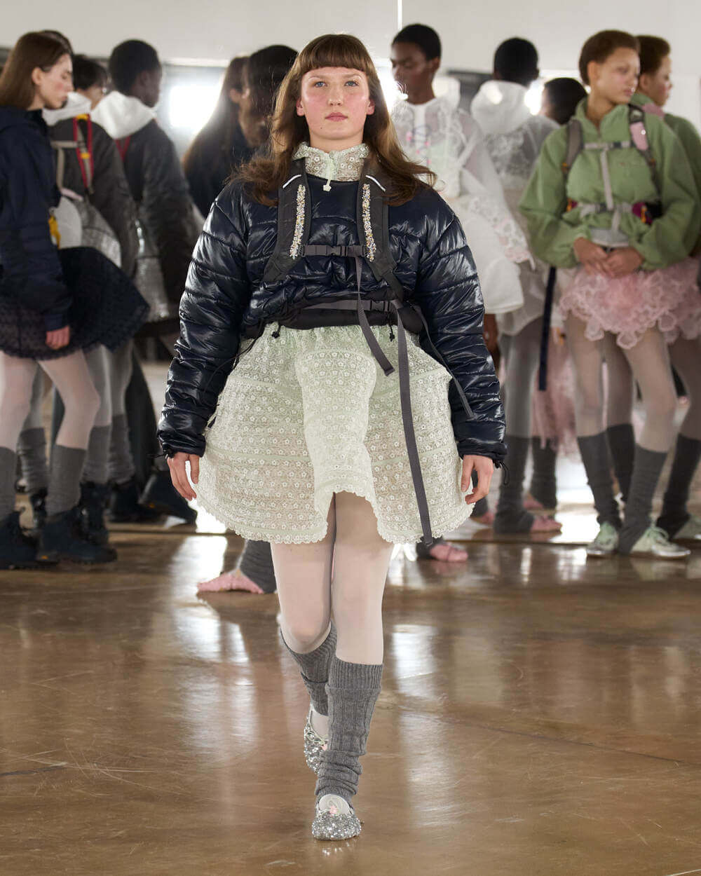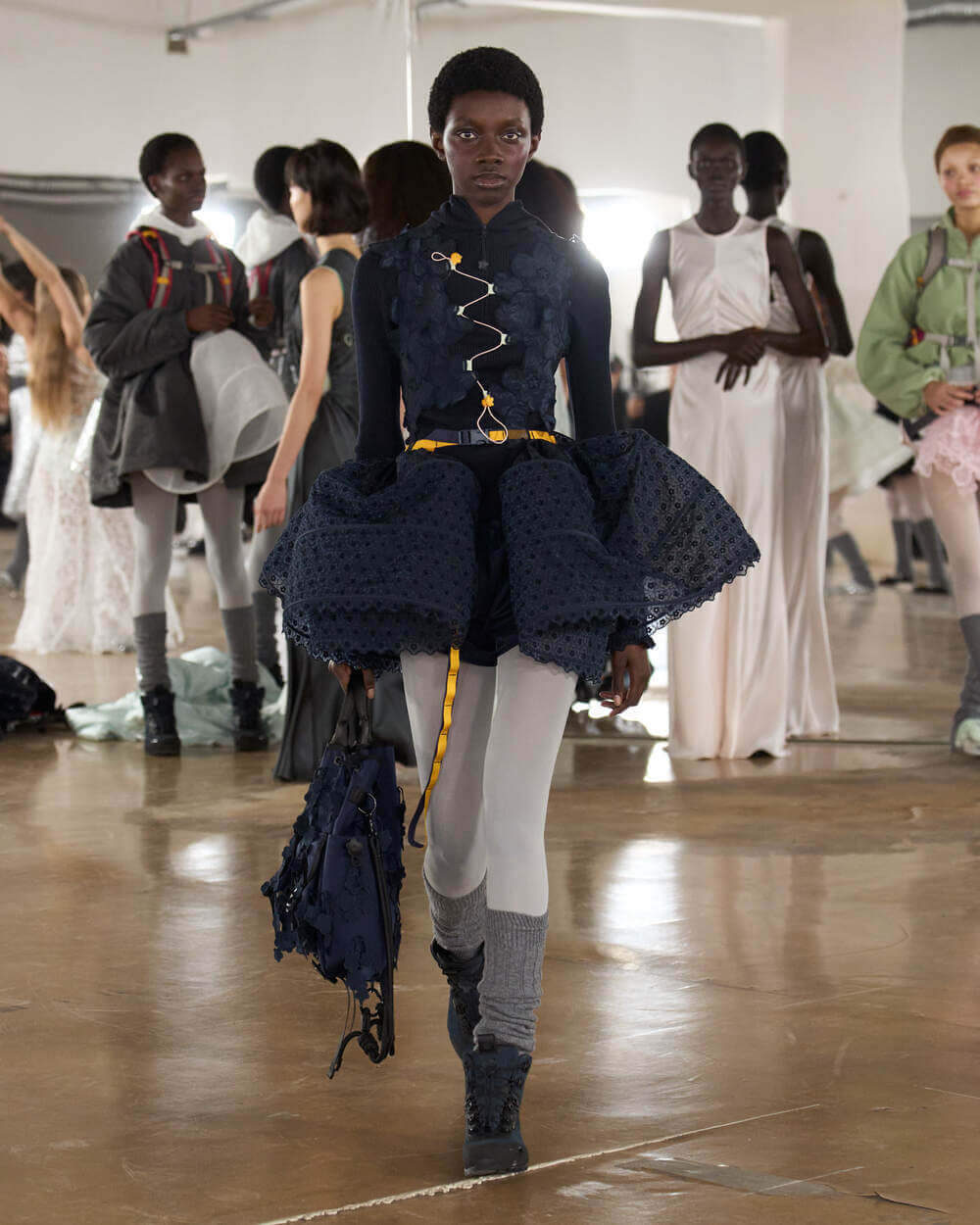 Couture met with ease as dancers stretched and warmed up where movement brought life to the pieces. Soft feminine elements were blended over technical performance items. Sculptural dresses paired with recycled nylon jackets balancing between functionality and style. With every movement we saw shape and bounce. Walking among the dancers were models in delicate anglaise reinterpreted on technological organza to create a perforated, couture-inspired fabric. We also saw Cecilie Bahnsen’s ongoing collaboration with The North Face including a romantic viewpoint reimaging bags using iconic silhouettes from the archive.