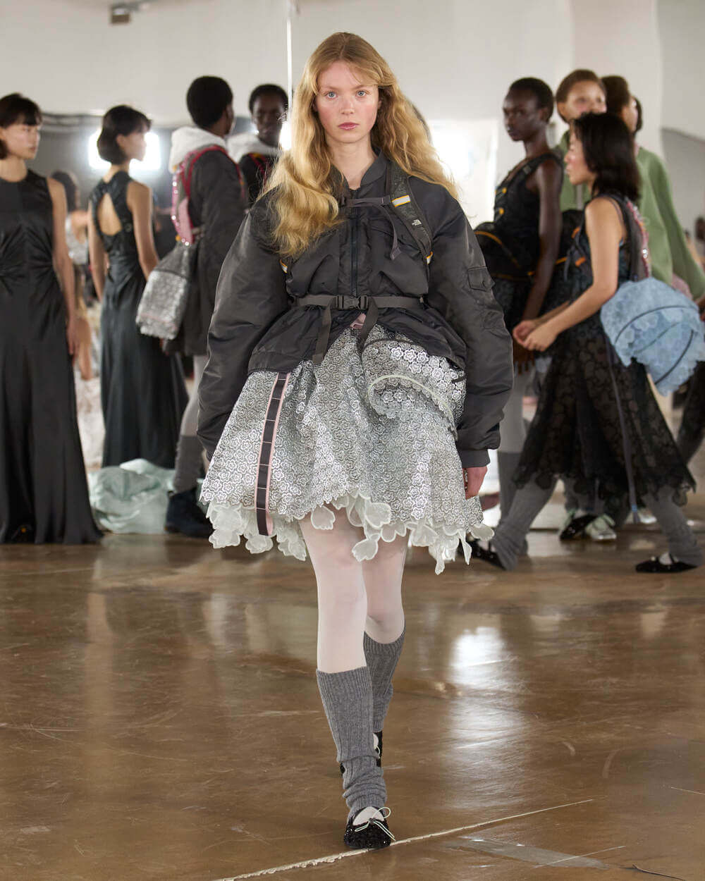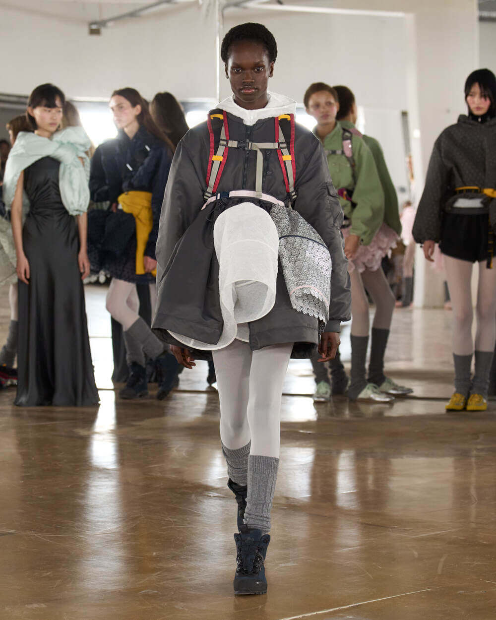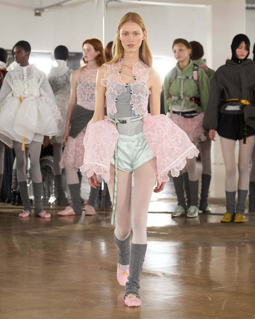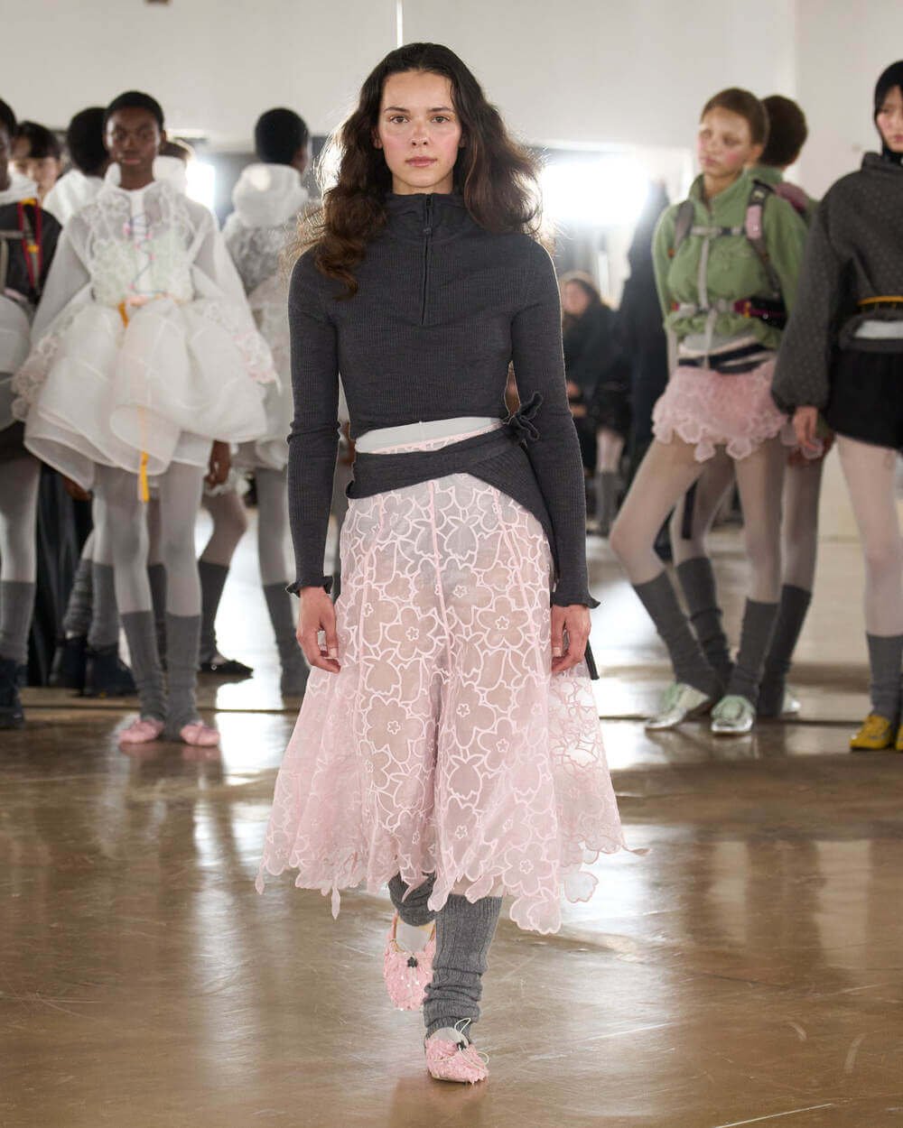 Couture met with ease as dancers stretched and warmed up where movement brought life to the pieces. Soft feminine elements were blended over technical performance items. Sculptural dresses paired with recycled nylon jackets balancing between functionality and style. With every movement we saw shape and bounce. Walking among the dancers were models in delicate anglaise reinterpreted on technological organza to create a perforated, couture-inspired fabric. We also saw Cecilie Bahnsen’s ongoing collaboration with The North Face including a romantic viewpoint reimaging bags using iconic silhouettes from the archive.