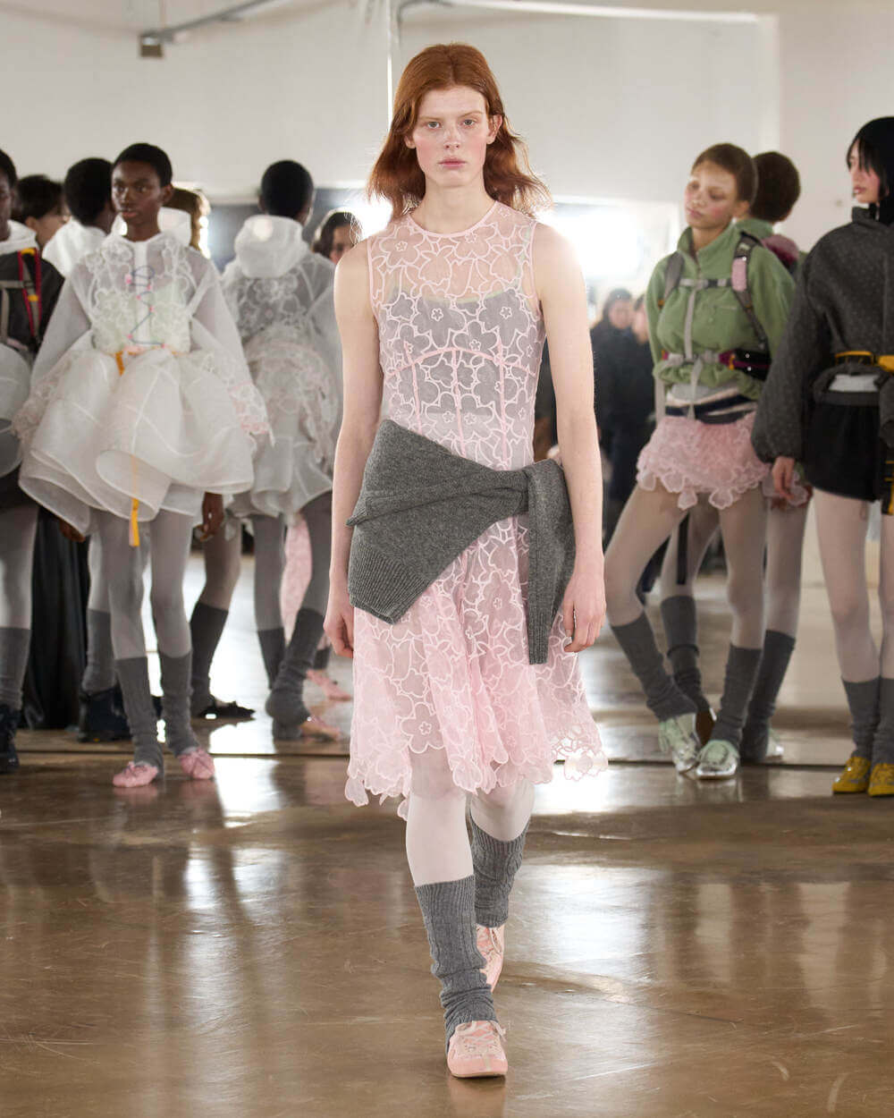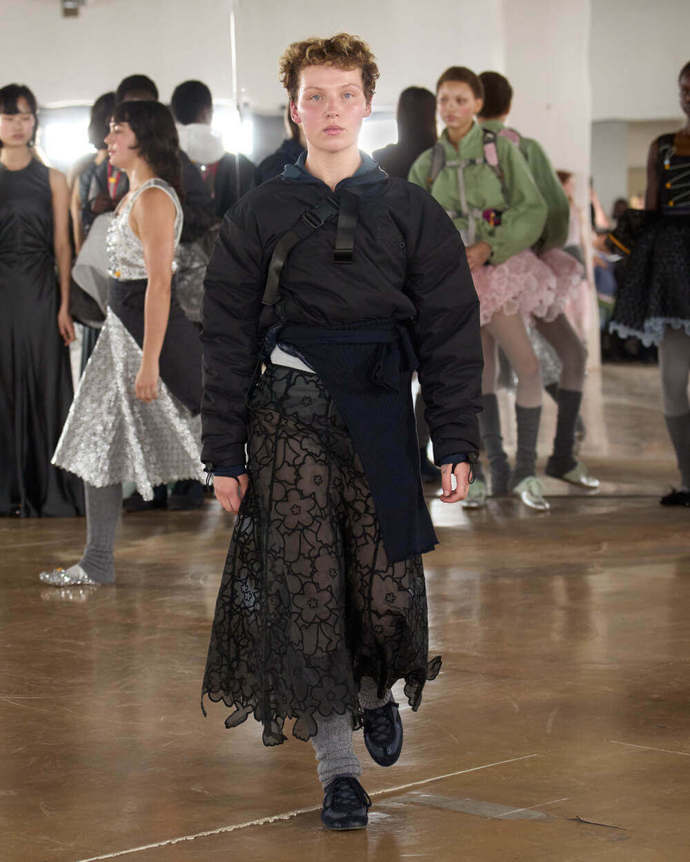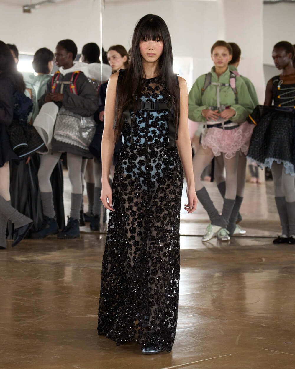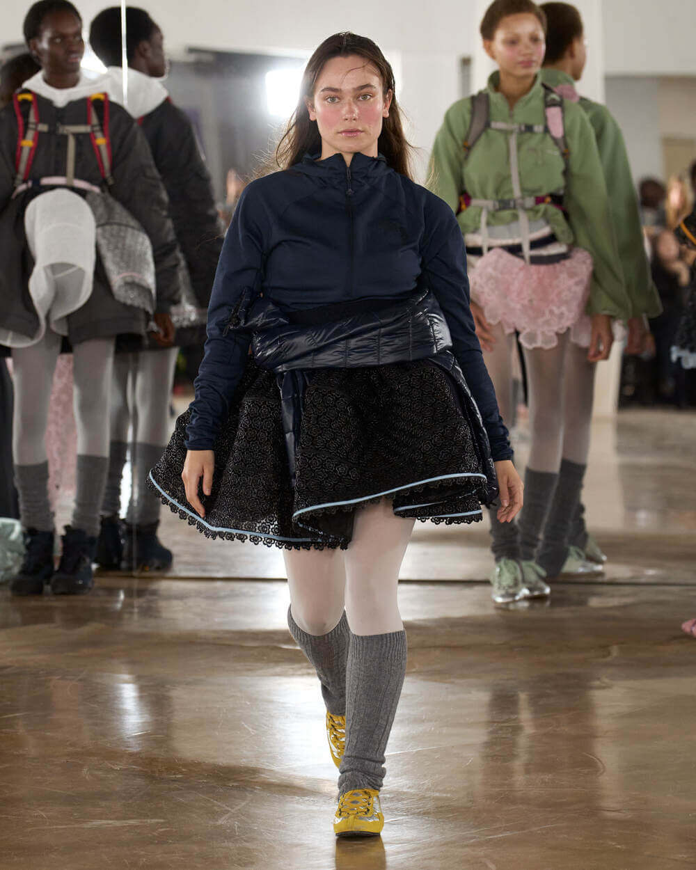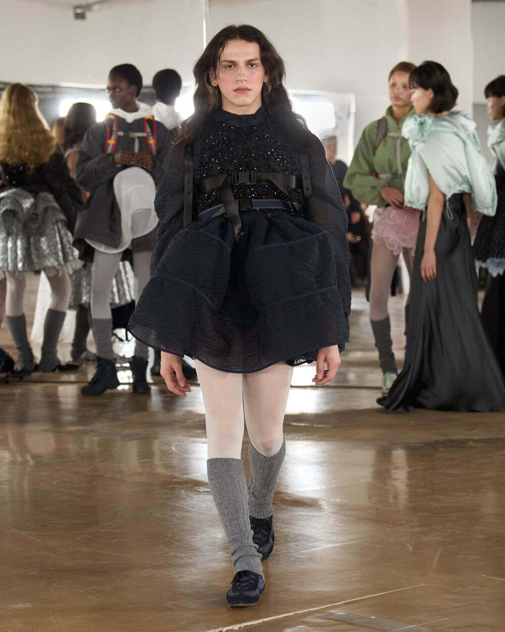 Couture met with ease as dancers stretched and warmed up where movement brought life to the pieces. Soft feminine elements were blended over technical performance items. Sculptural dresses paired with recycled nylon jackets balancing between functionality and style. With every movement we saw shape and bounce. Walking among the dancers were models in delicate anglaise reinterpreted on technological organza to create a perforated, couture-inspired fabric. We also saw Cecilie Bahnsen’s ongoing collaboration with The North Face including a romantic viewpoint reimaging bags using iconic silhouettes from the archive.
