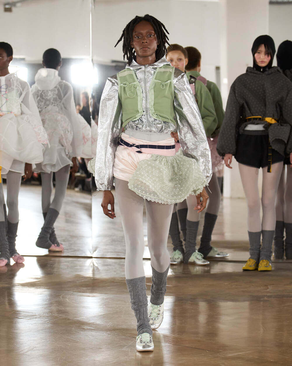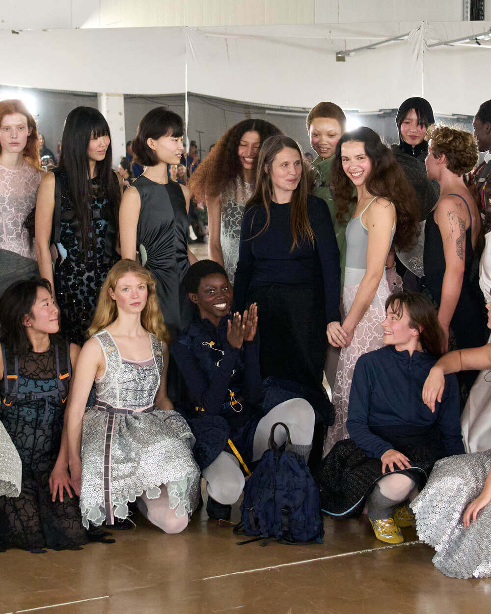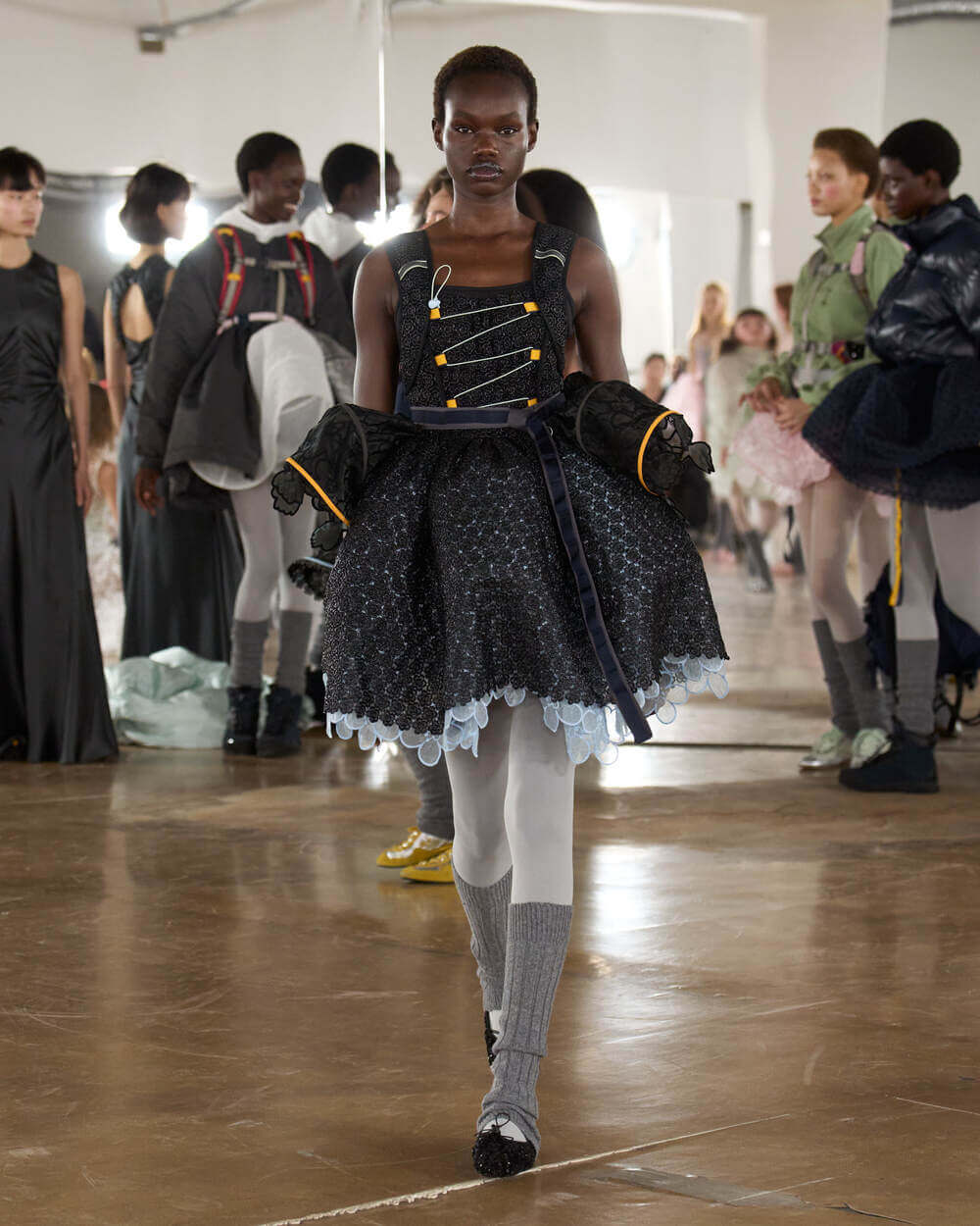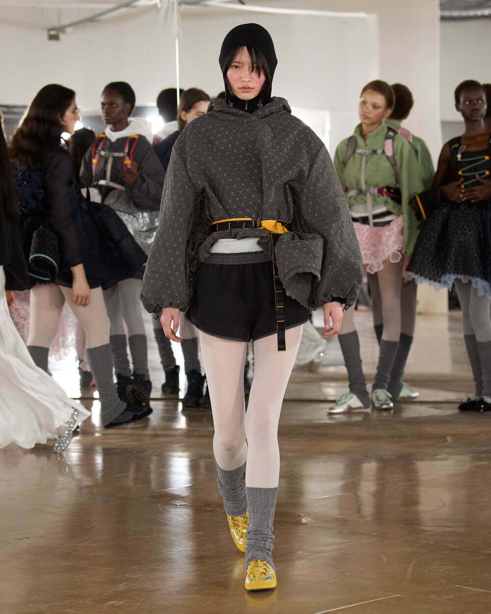 Couture met with ease as dancers stretched and warmed up where movement brought life to the pieces. Soft feminine elements were blended over technical performance items. Sculptural dresses paired with recycled nylon jackets balancing between functionality and style. With every movement we saw shape and bounce. Walking among the dancers were models in delicate anglaise reinterpreted on technological organza to create a perforated, couture-inspired fabric. We also saw Cecilie Bahnsen’s ongoing collaboration with The North Face including a romantic viewpoint reimaging bags using iconic silhouettes from the archive.