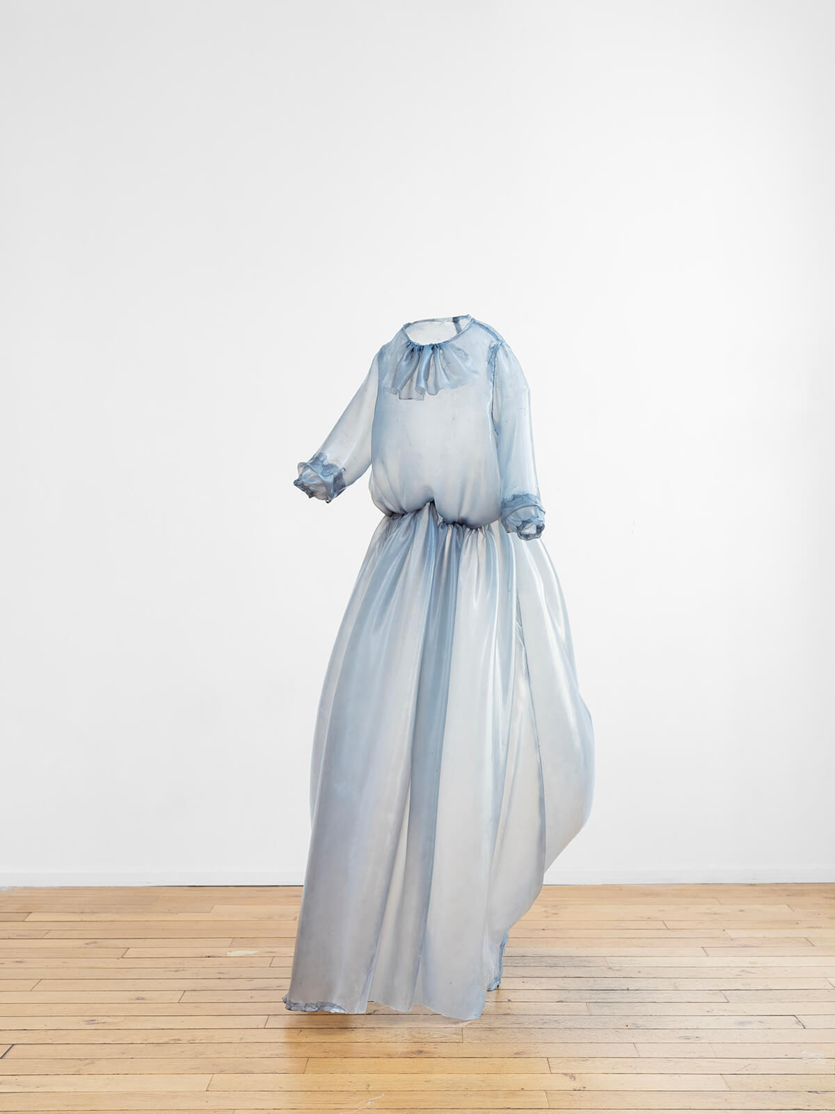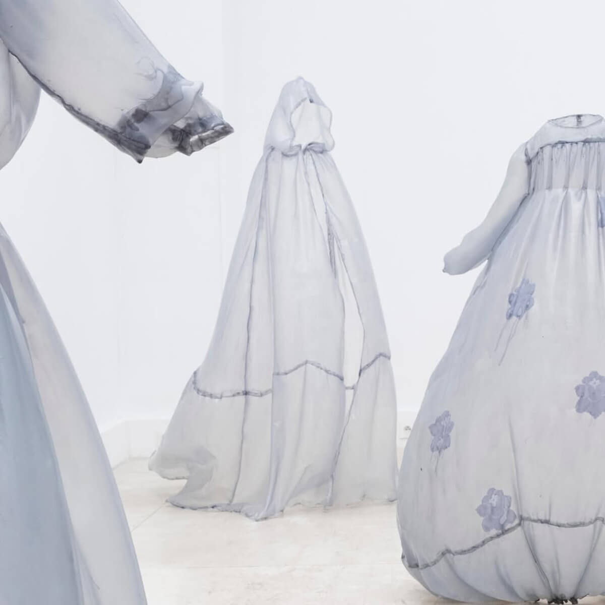 Though the exhibition has now closed, its spectral presence continues to resonate. In his latest series of resin-cast ‘Ghost Dresses’, Brandon Morris transformed garments into apparitions, delicate forms suspended between fashion and sculpture. Each piece, crafted from green-tinted resin inflated with air rather than shaped around mannequins, appeared frozen mid-motion, as if the fabric were breathing.
