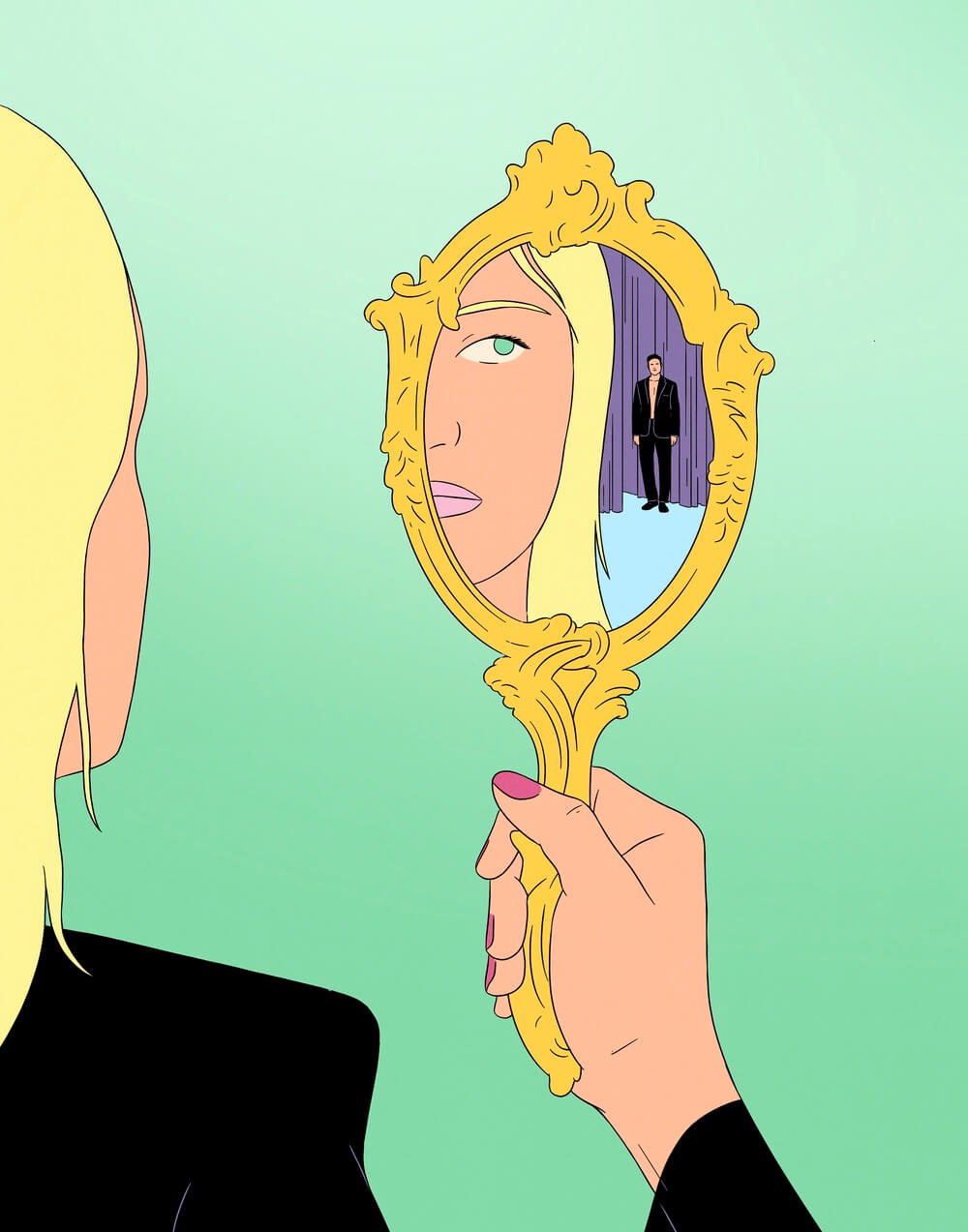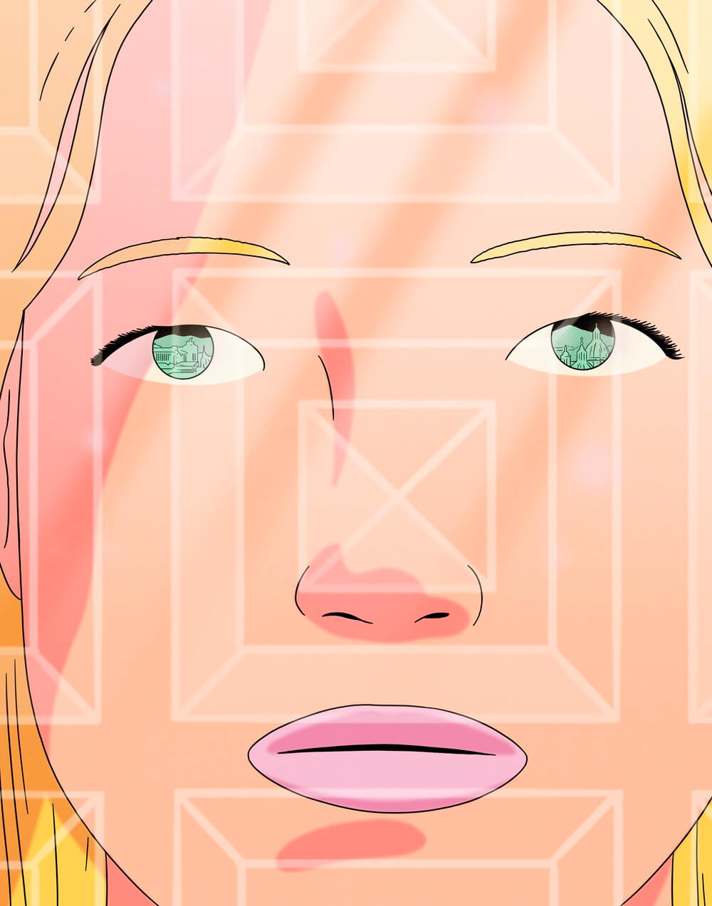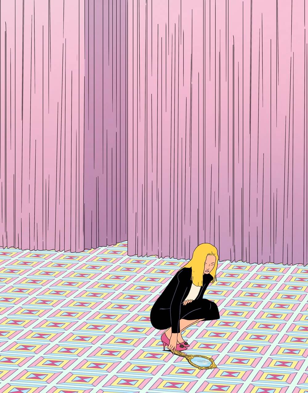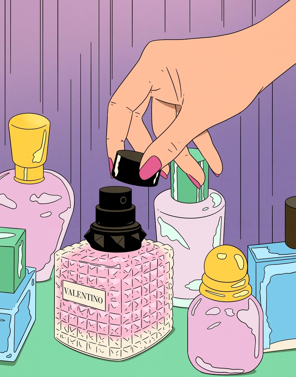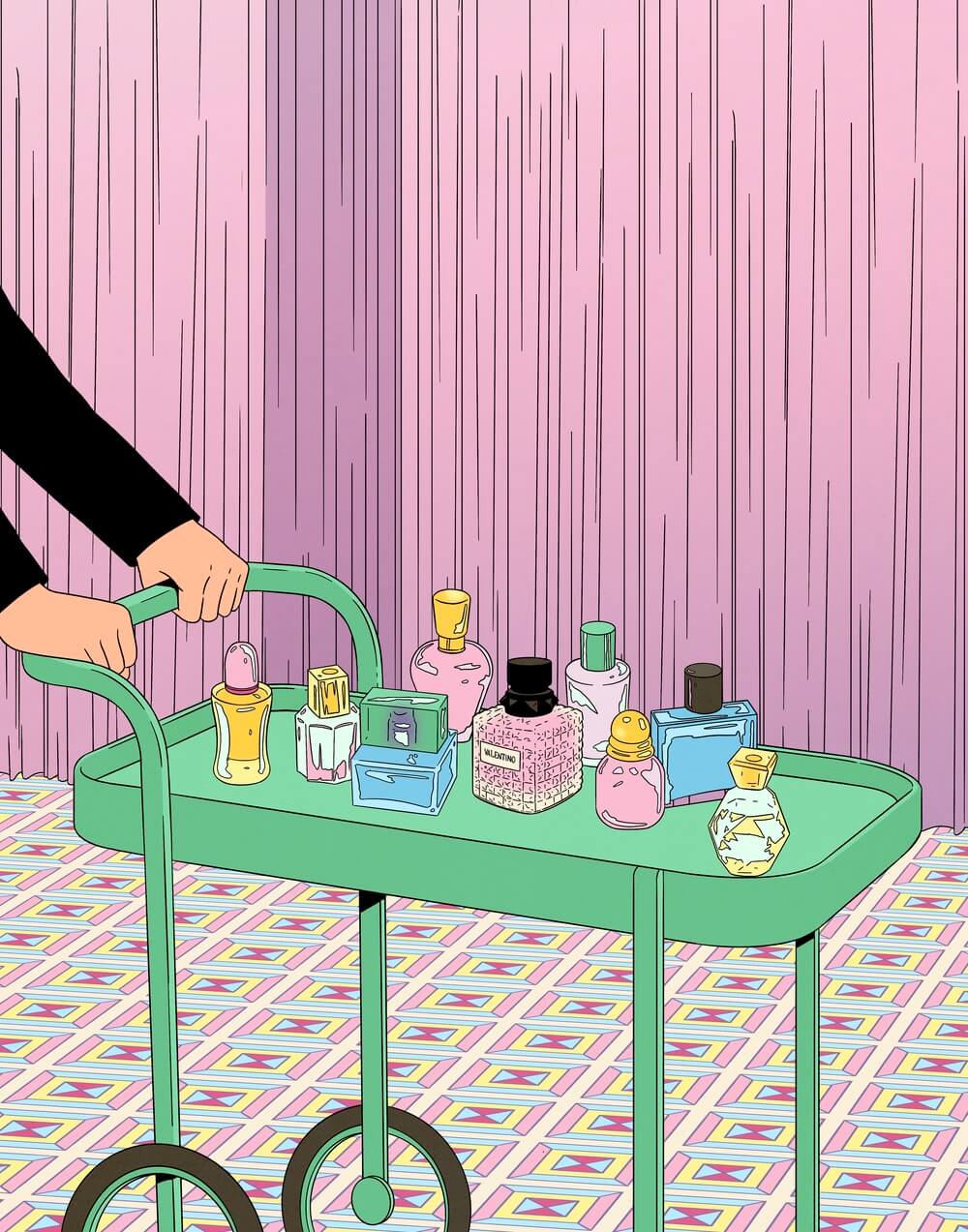 Among the collaborations, Born in Roma meets the graphic world of Simon Bailly, where the fragrance becomes the protagonist of a visual narrative. “A young woman wanders through a multicolored labyrinth… she finds a mirror, picks it up, and looks at herself. From the shadows of a labyrinth to the brilliance of the light, she chooses Valentino.”