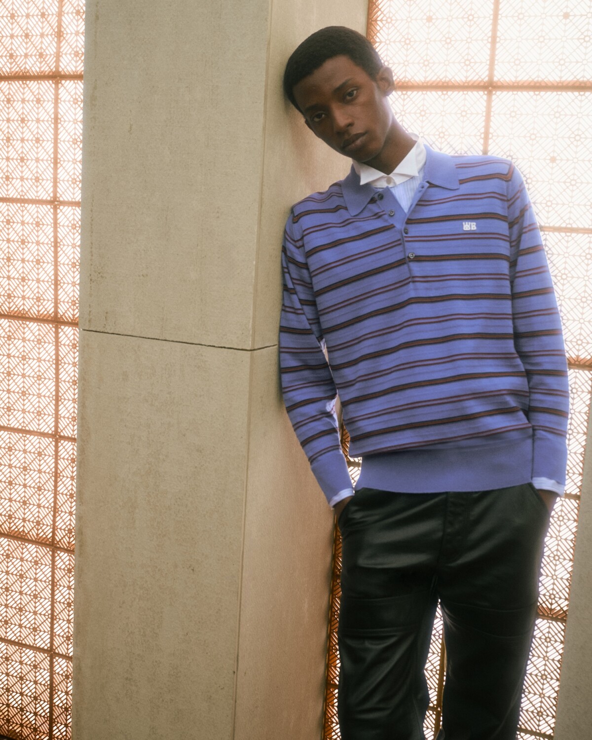 Shot in London by Malick Bodian, the lookbook channels the human modernism of Balkrishna Doshi, treating clothes as intimate structures rather than statements. Uniform silhouettes are softened through silk, wool and satin gestures: polo shirts crossed by ceremonial sashes, controlled colour blocking in ivory and Atlantic blue, and outerwear defined by subtle grid patterns.