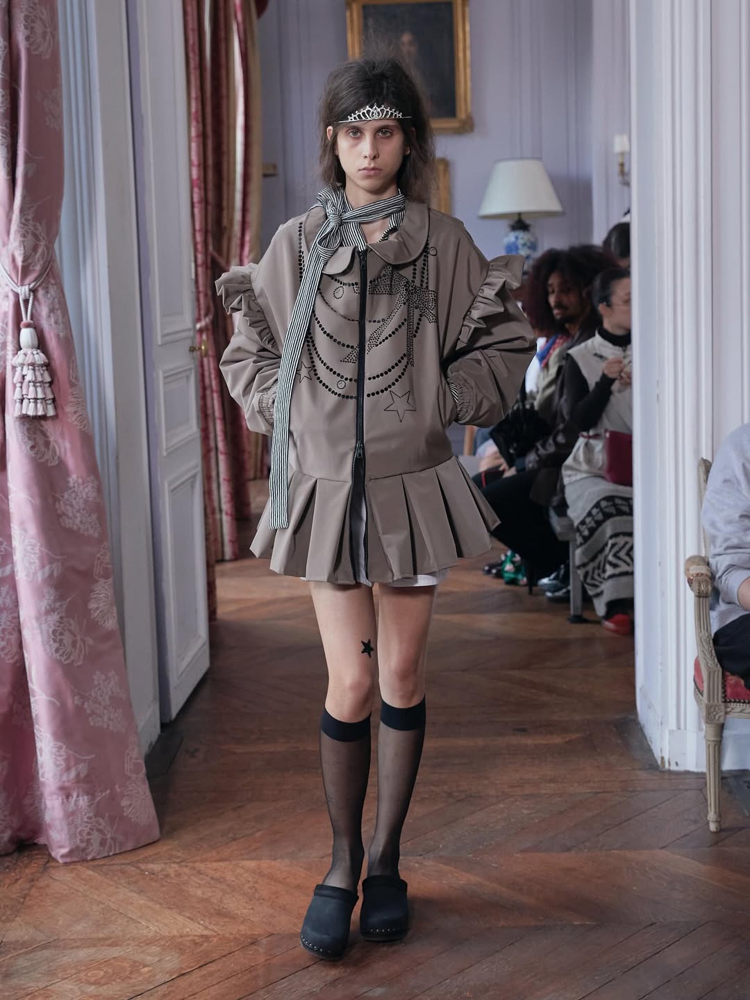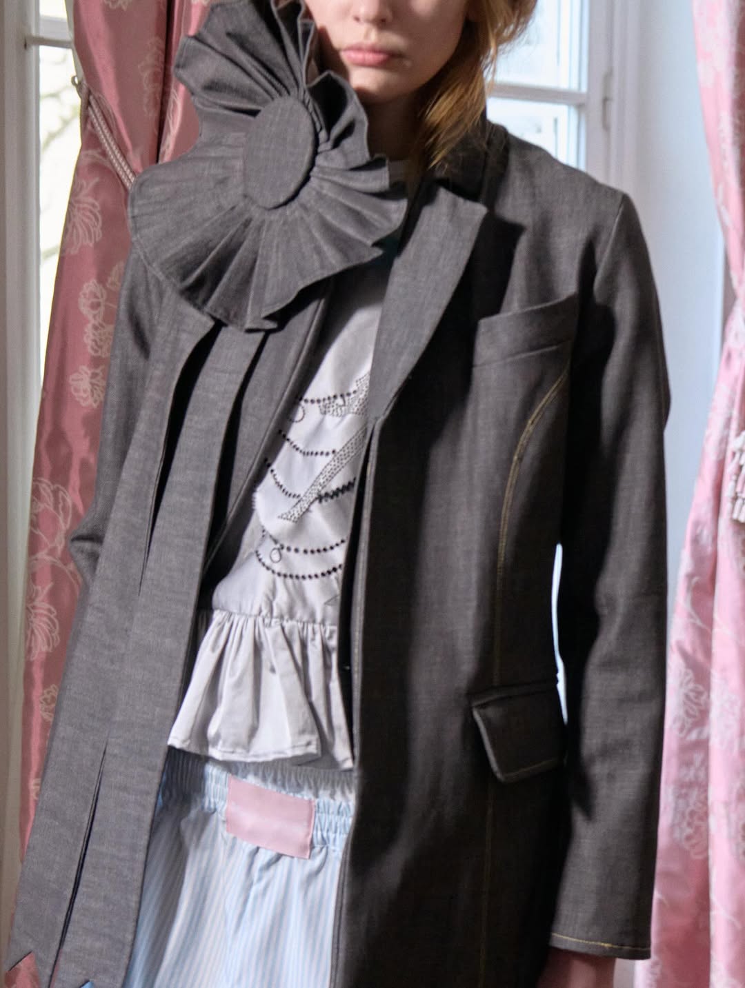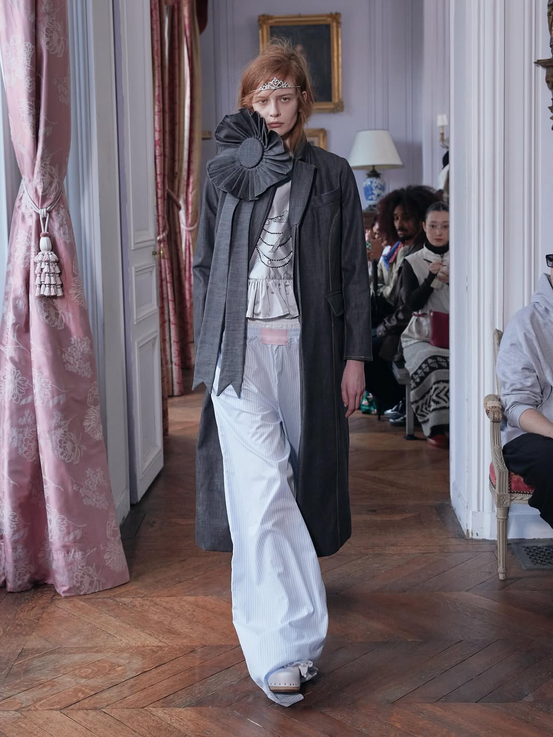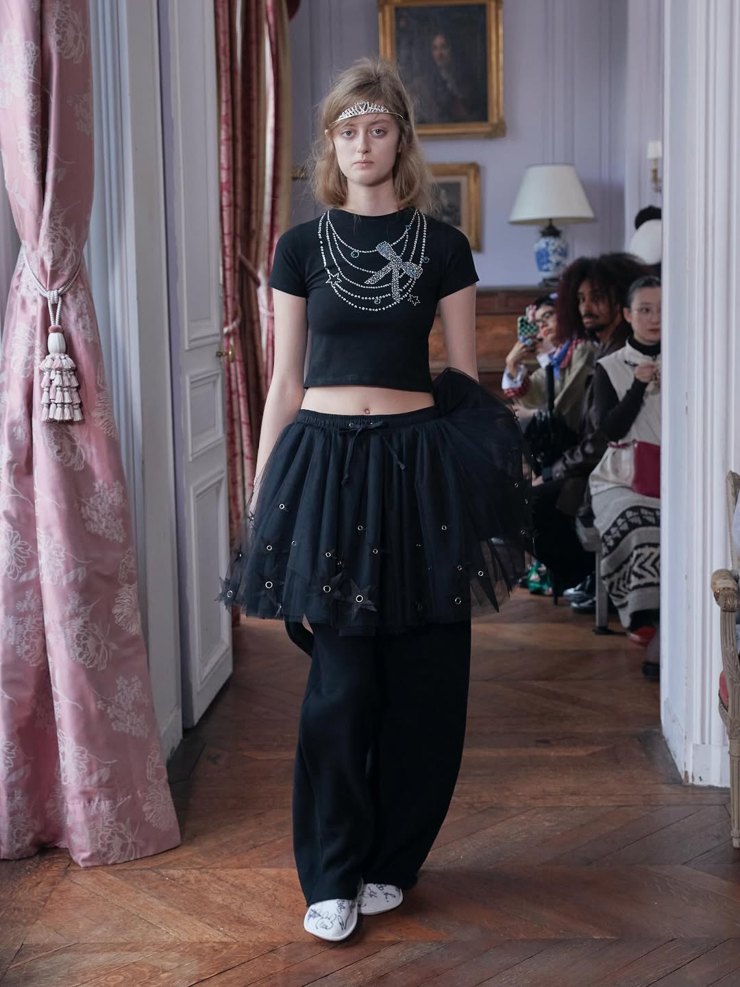 Another reference shapes the emotional tone. Leitner recalls the scene in ‘Sex and the City’ where Carrie runs through snowy New York in pajamas on New Year’s Eve. The collection develops that tension between private intimacy and public visibility through boxer shorts, sheer layers over pink lingerie and relaxed silhouettes finished with tiaras.