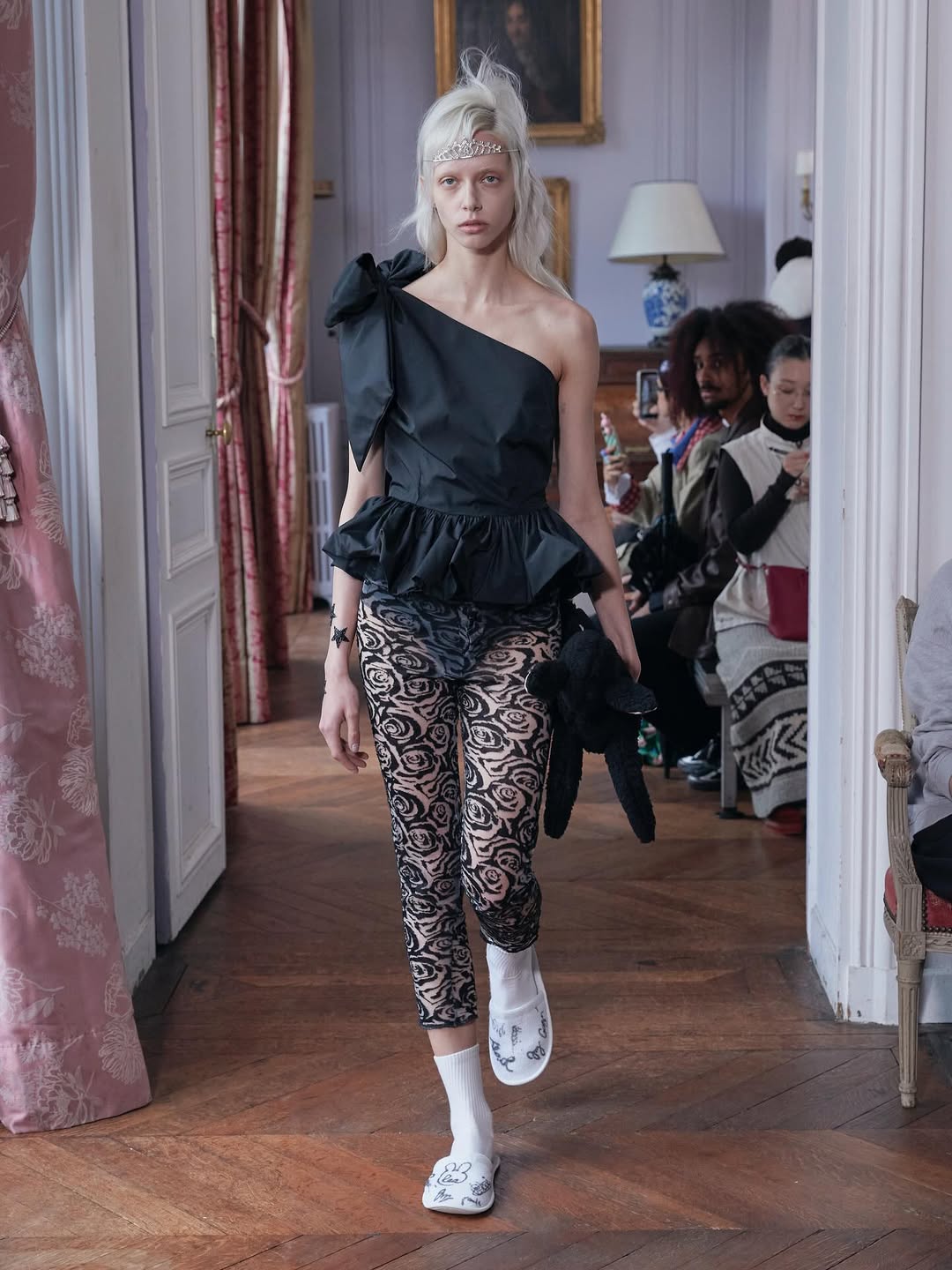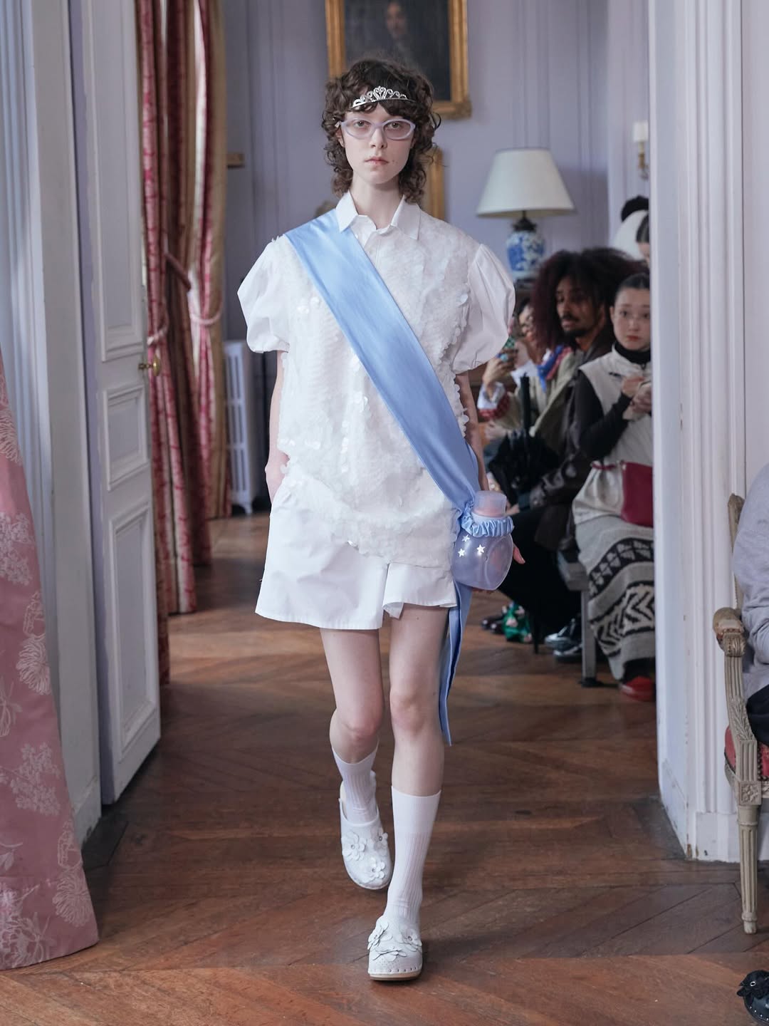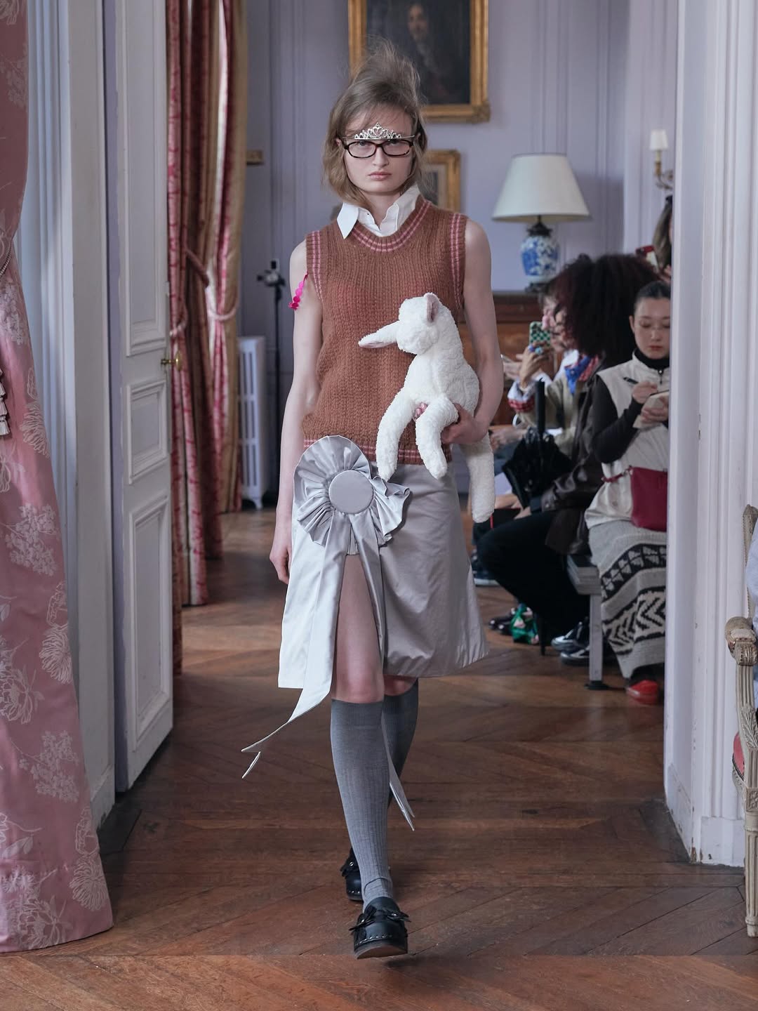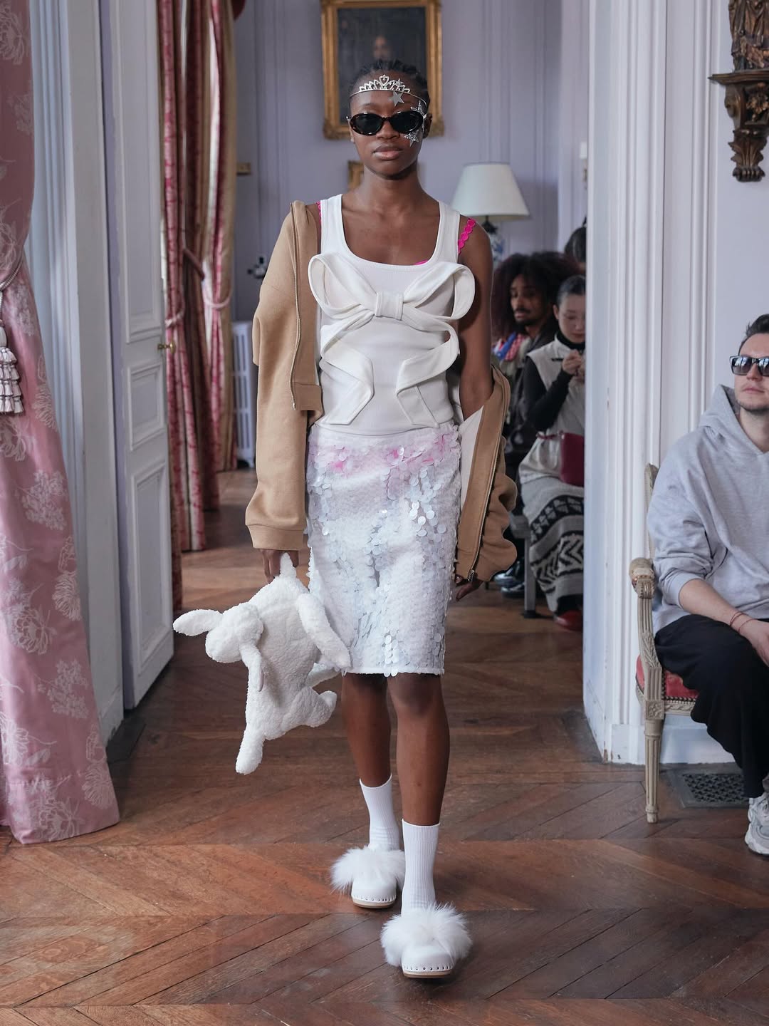 Accessories reinforce the playful narrative. Lamb shaped bags, sleeping masks used as headpieces and glitter prize bows reinterpret symbols of dreams, rest and recognition. The palette grounds the fantasy in winter tones of black, grey and white, punctuated by soft pink, pale blue and flashes of metallic shine.