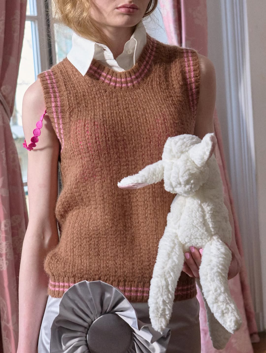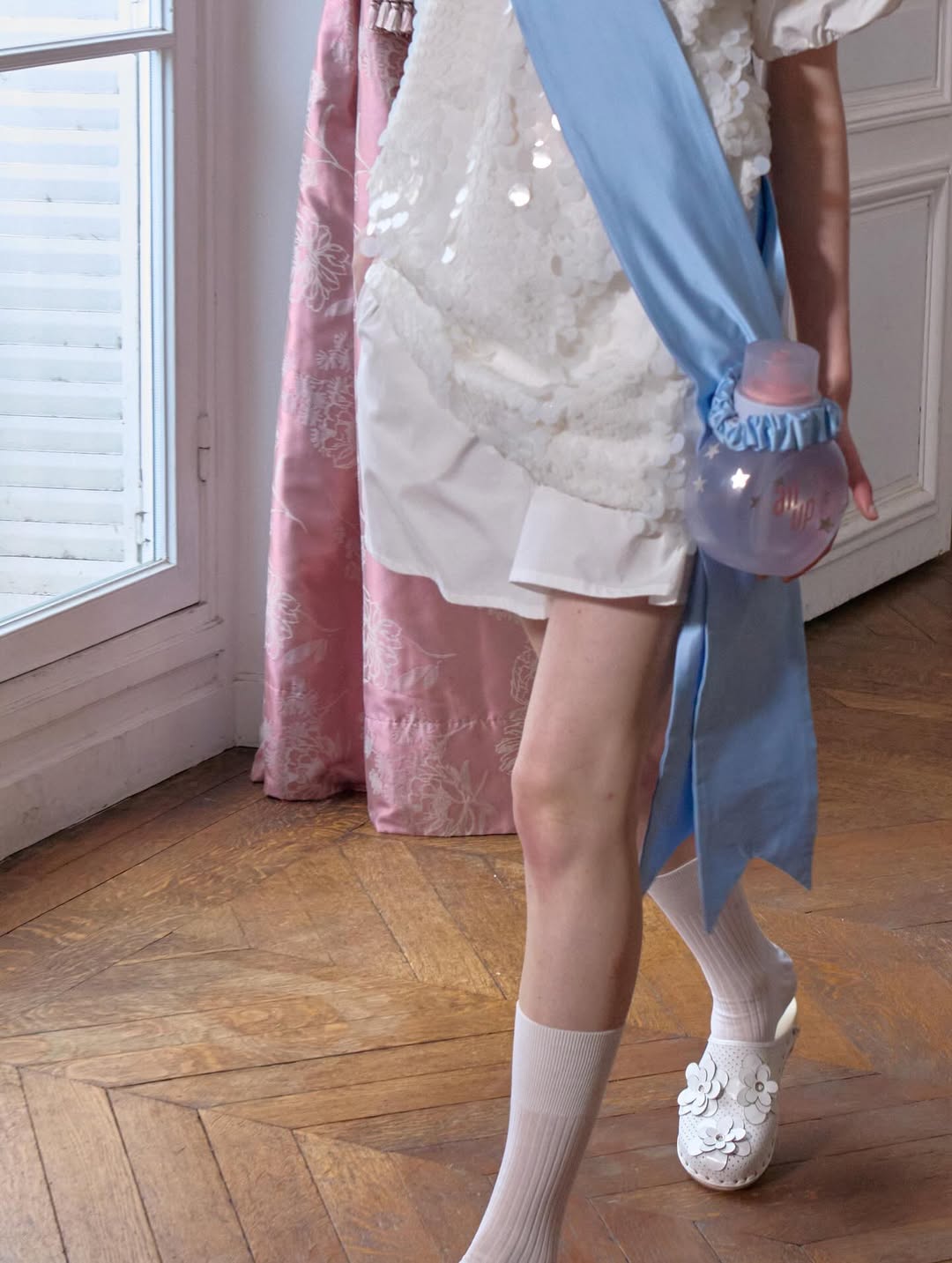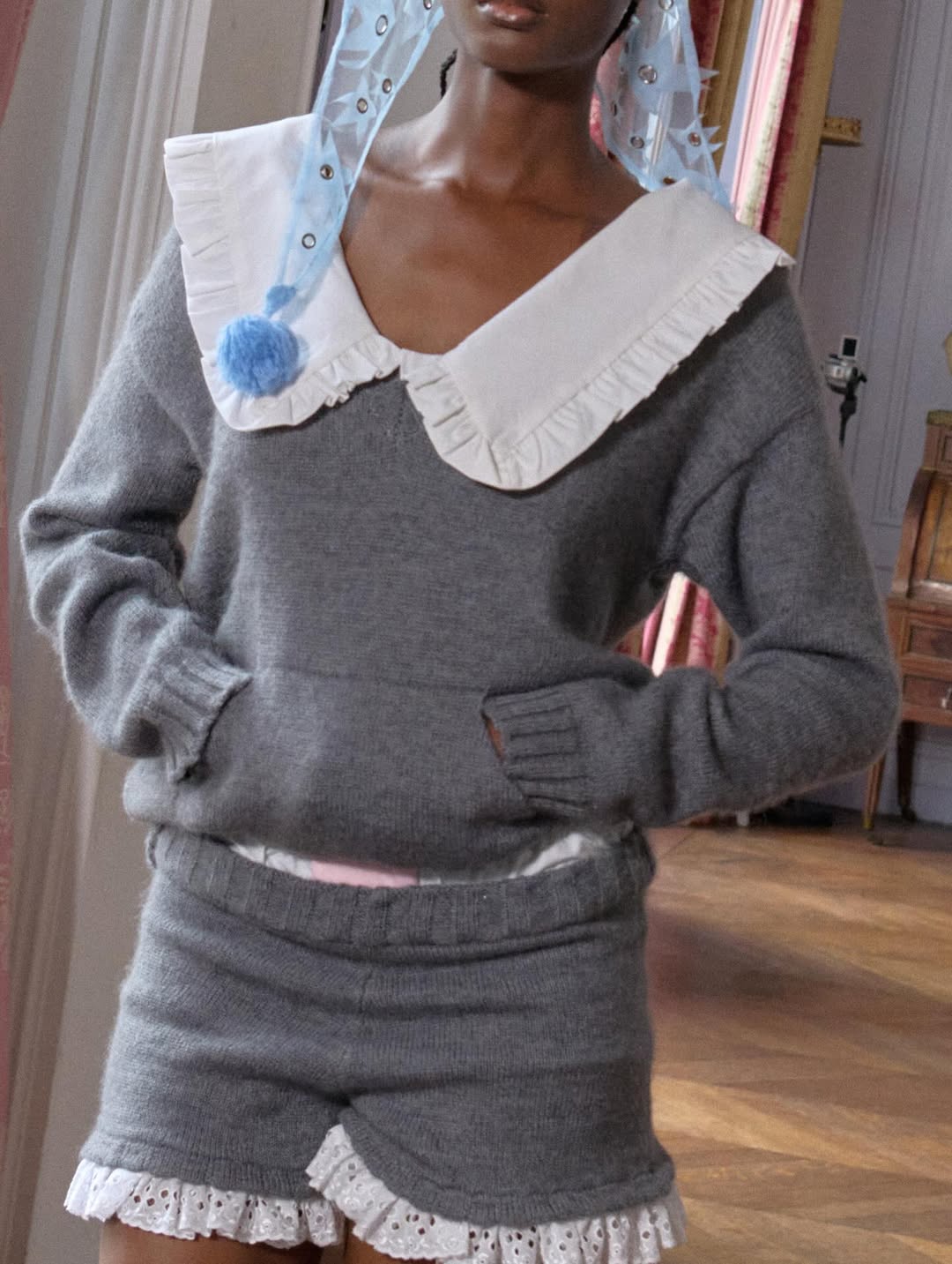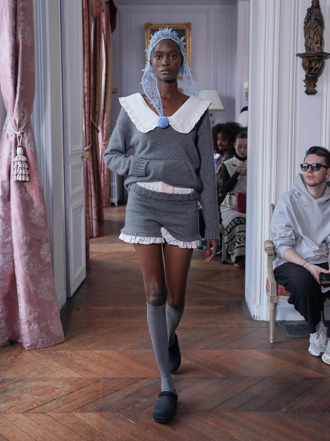 Accessories reinforce the playful narrative. Lamb shaped bags, sleeping masks used as headpieces and glitter prize bows reinterpret symbols of dreams, rest and recognition. The palette grounds the fantasy in winter tones of black, grey and white, punctuated by soft pink, pale blue and flashes of metallic shine.