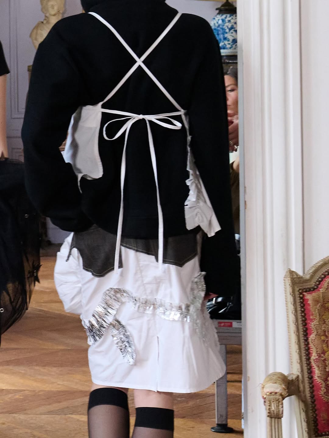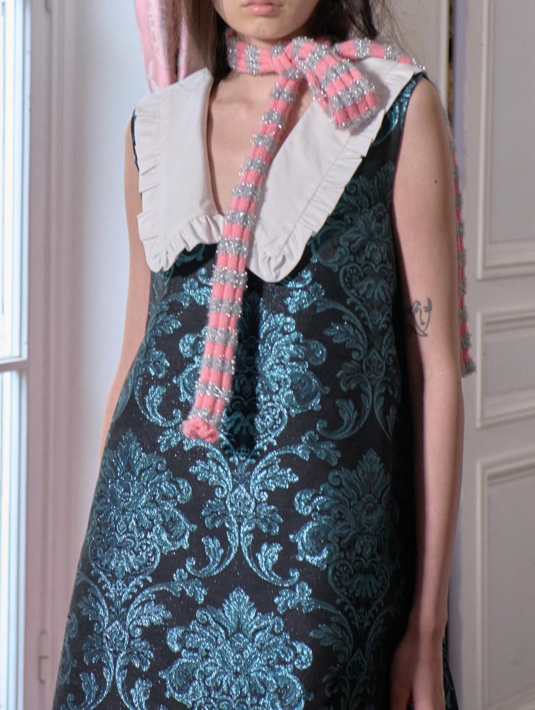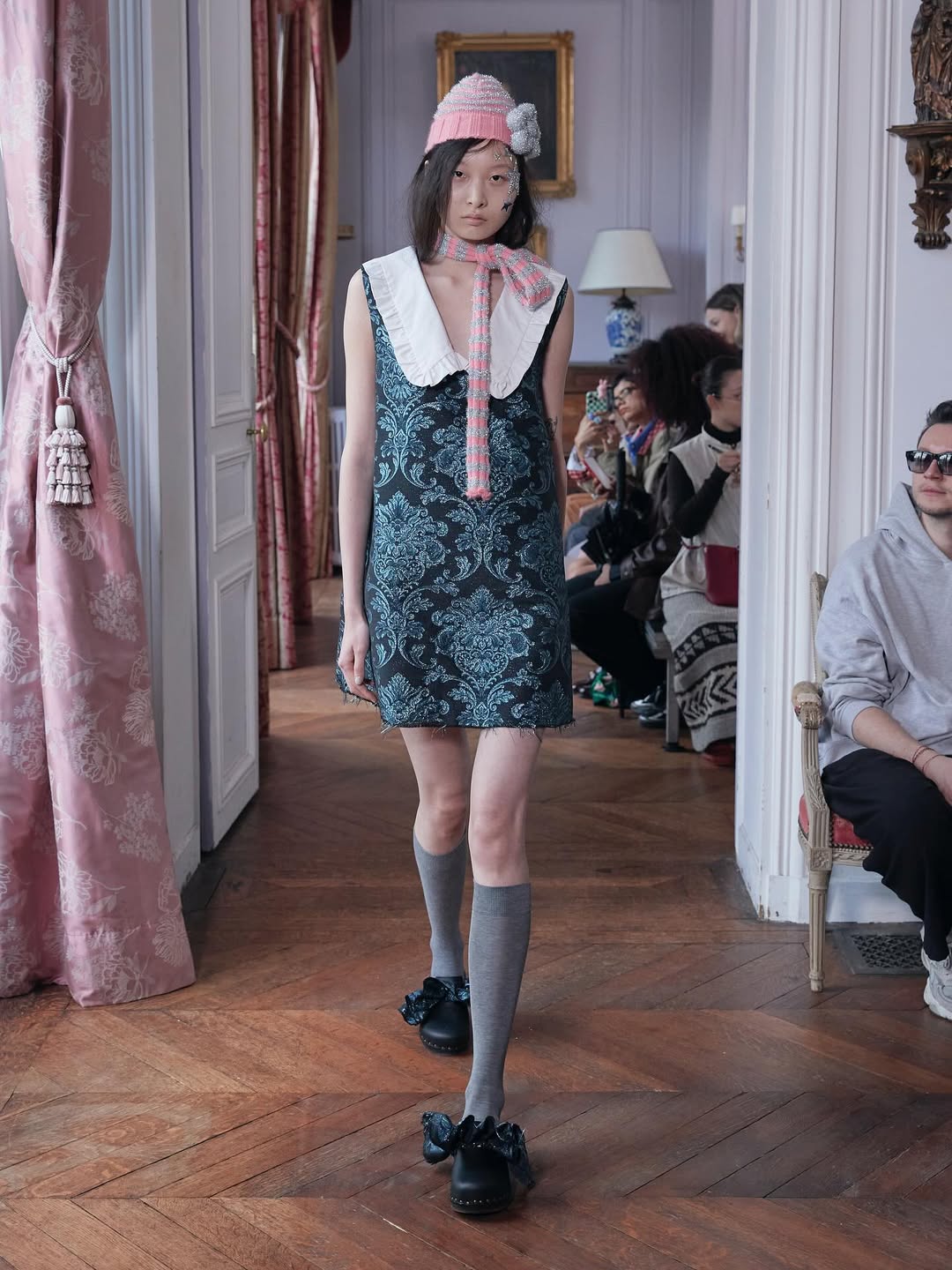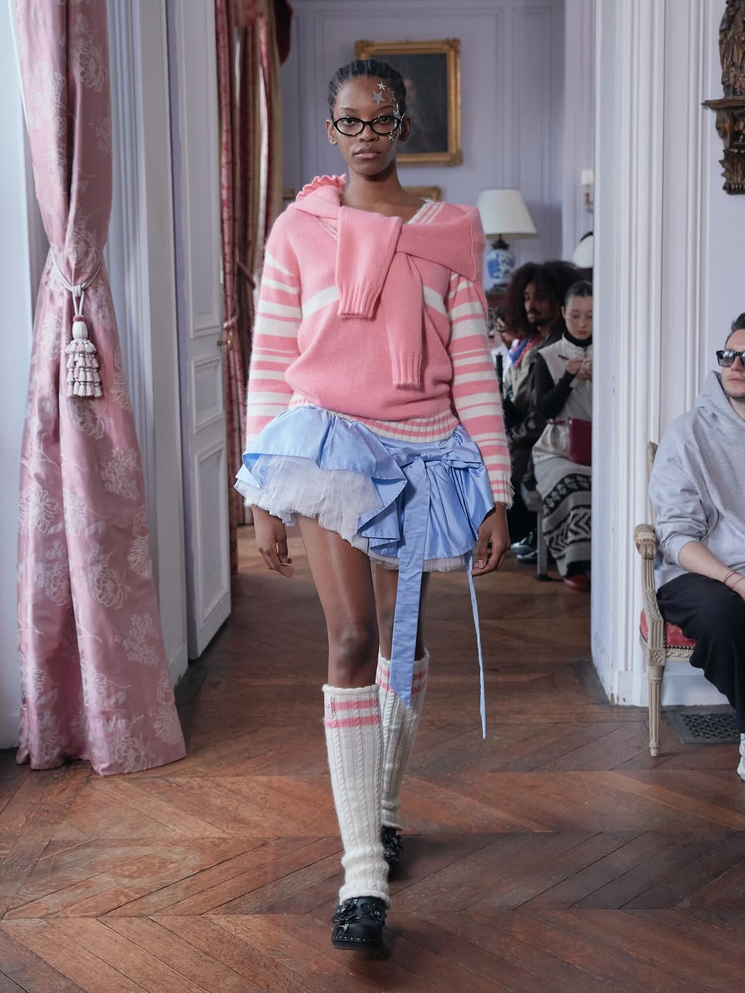 Accessories reinforce the playful narrative. Lamb shaped bags, sleeping masks used as headpieces and glitter prize bows reinterpret symbols of dreams, rest and recognition. The palette grounds the fantasy in winter tones of black, grey and white, punctuated by soft pink, pale blue and flashes of metallic shine.