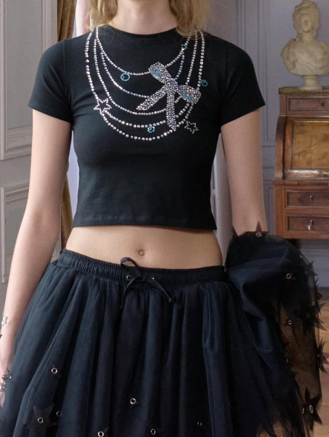 Star motifs run across the collection as both decoration and metaphor. Laser cut shapes punctuate tops and outerwear, glitter appears on the models’ faces, and star jewelry elements integrate directly into jackets and shirts. The imagery builds a dreamlike universe where aspiration becomes visible through playful details.